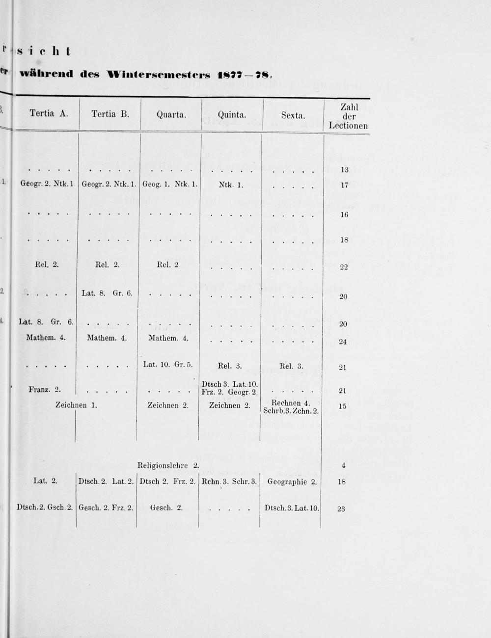 s i cht er wäührend des Wintersemesters 1877—28. — Lanl . Tertia A. Tertia B. Quarta. Quinta. Sexta. der 1 2 Lectionen 13 1. Geogr. 2. Ntk. 1. Geogr. 2. Ntk. 1. Geog. 1. Ntk. 1. Ntk. 1. 17 16 18 Rel. 2. Rel. 2. Rel. 2 22 2 Lat. 8. Gr. 6. 20 4 Lat. 8. Gr. 6. 20 Mathem. 4. Mathem. 4. Mathem. 4. 24 Lat. 10. Gr. 5. Rel. 3. Rel. 3. 21 , Dtsch 3. Lat. 10. Franz. 2. Frz. 2. Geogr. 2. 21 . 4; 9 Rechnen 4. 5 Zeichnen 1. Zeichnen 2. Zeichnen 2. Schrb.&. ZChn. 2. 15 Religionslehre 2. 4 Lat. 2. Dtsch. 2. Lat. 2. 8 2. Fræ. 2. Rehn. 3. Schr. 3. Geographie 2. 18 Dtsch. 2. Gsch. 2. Gesch. 2. Fræ.2. Gesch. 2. Dtsch. 3. Lat. 10. 23