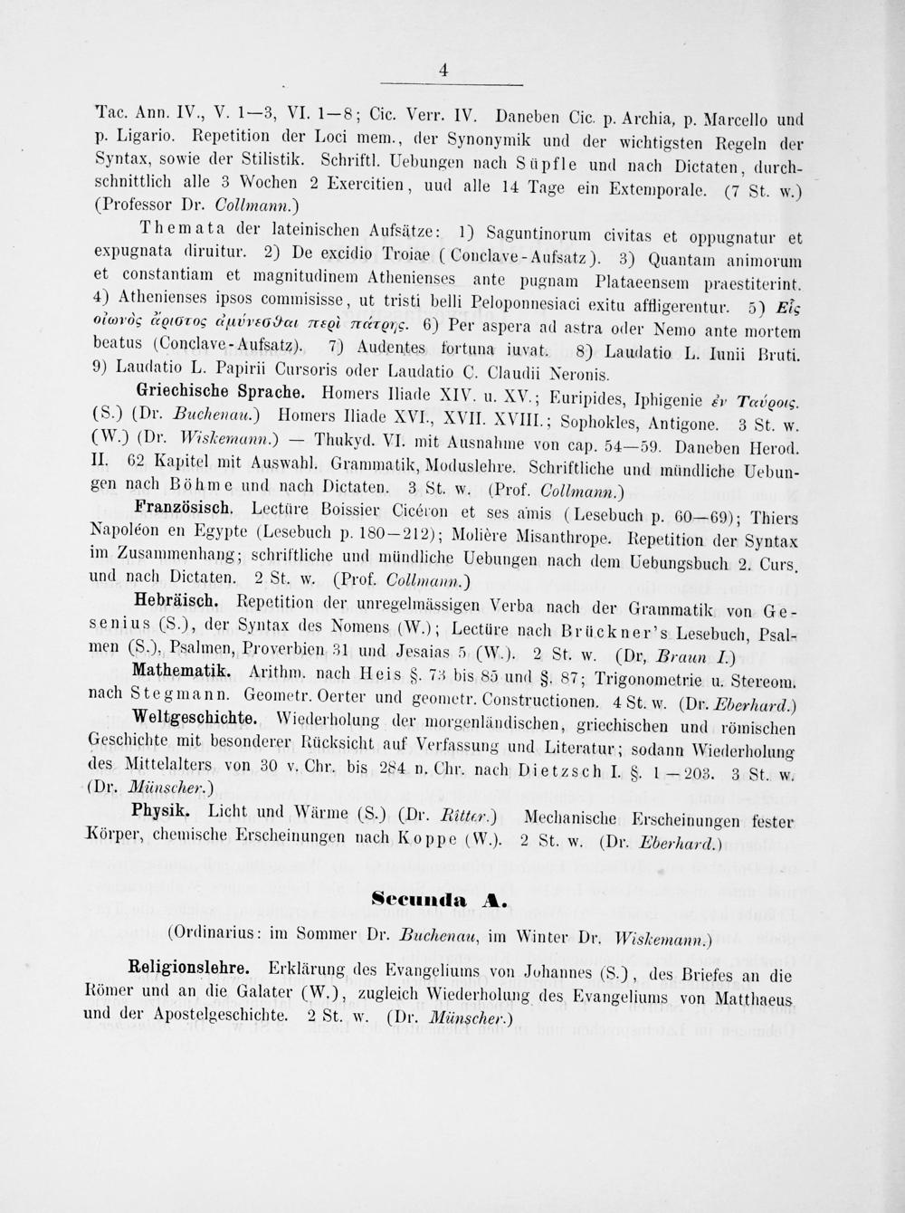 Tac. Ann. IV., V. 1— 3, VI. 1—8; Cic. Verr. IV. Daneben Cic. p. Archia, p. Marcello und p. Ligario. Repetition der Loci mem., der Synonymik und der wichtigsten Regeln der Syntax, sowie der Stilistik. Schriftl. Uebungen nach Süpfle und nach Dictaten, durch- schnittlich alle 3 Wochen 2 Exercitien, uud alle 14 Tage ein Extemporale.(7 St. wW.) (Professor Dr. Collmann.)