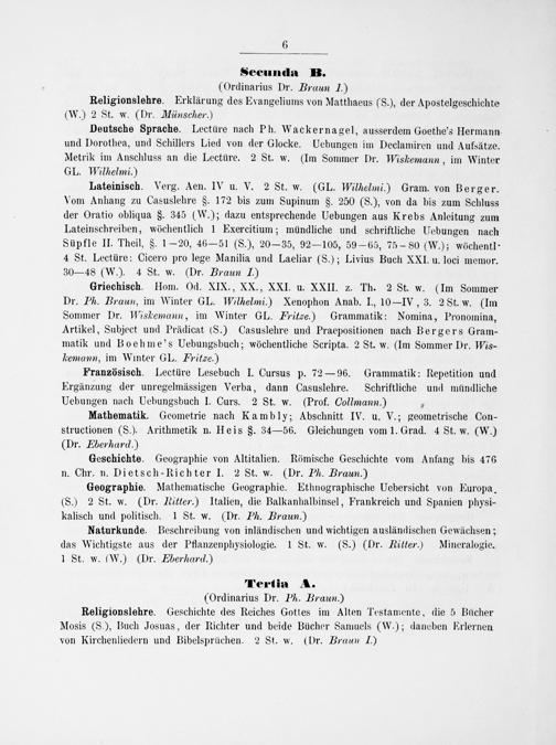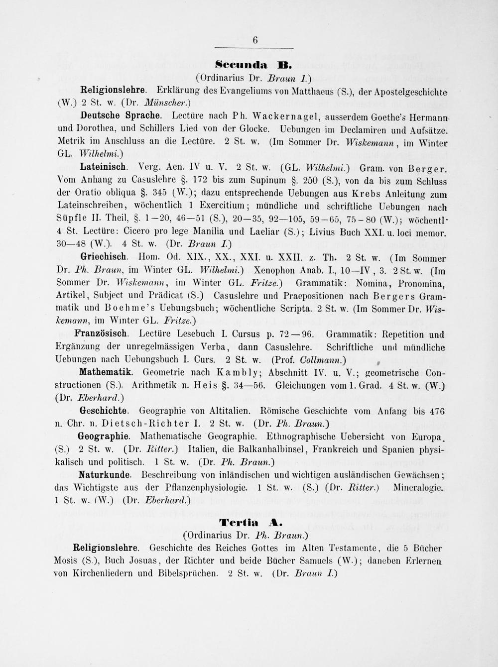 Tertia A. (Ordinarius Dr. Ph. Braun.) Religionslehre. Geschichte des Reiches Gottes im Alten Testamente, die 5 Bücher Mosis(S.), Buch Josuas, der Richter und beide Bücher Samuels(W.); daneben Erlernen von Kirchenliedern und Bibelsprüchen. 2 St. w.(Dr. Braun I.)