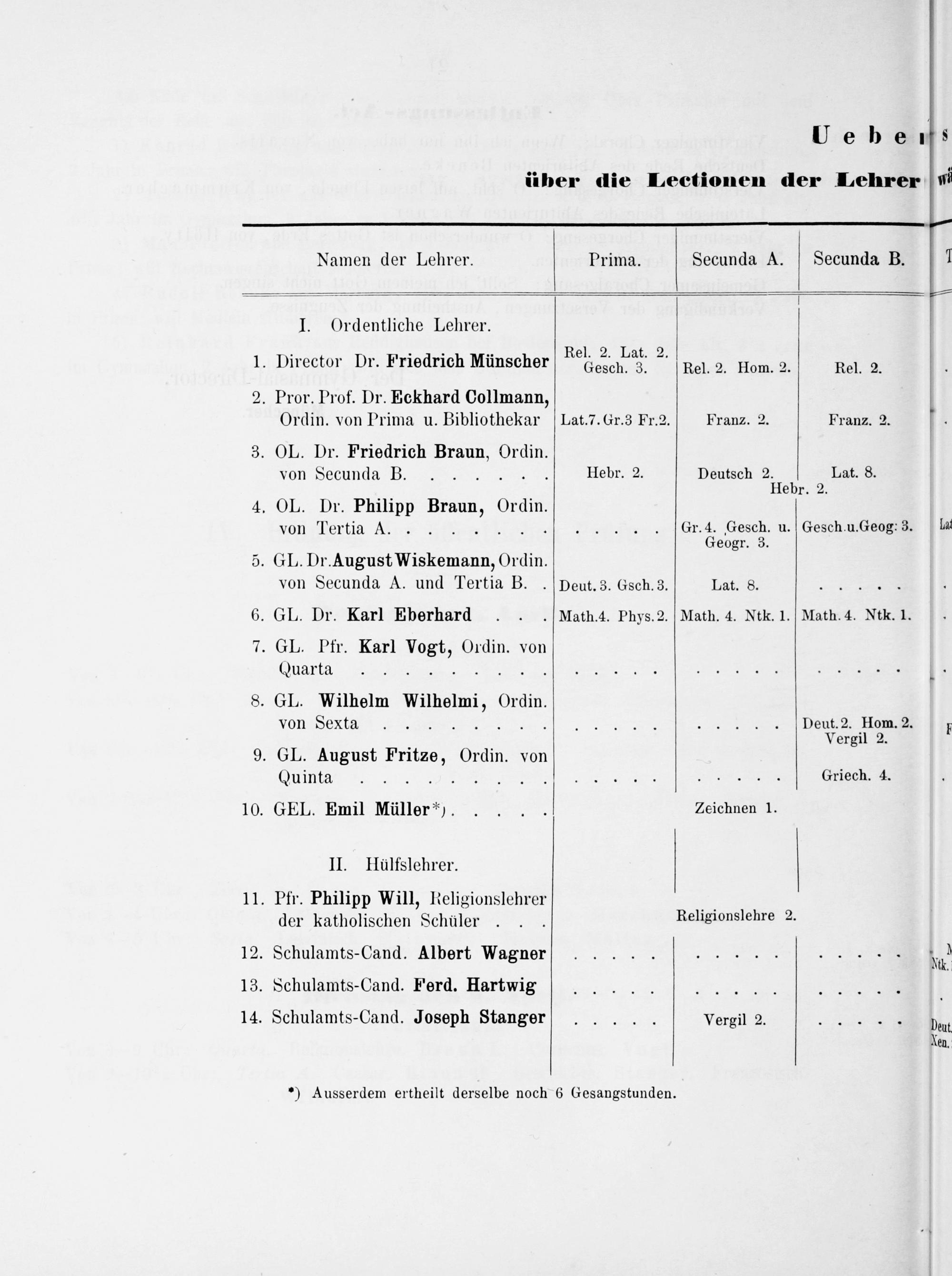 über die Lectionen der Lehrer 1ü Namen der Lehrer. Prima. Secunda A. Secunda B. T —— I. Ordentliche Lehrer. 1. Director Dr. Friedrich Münscher We Nant 2 Rel. 2. Hom. 2. Rel. 2. 2. Pror. Prof. Dr. Eckhard Collmann, Ordin. von Prima u. Bibliothekar Lat. 7. Gr. 3 Fr. 2. Franz. 2. Franz. 2. Y 3. OL. Dr. Friedrich Braun, Ordin. von Secunda B. Hebr. 2. Deutsch 2. Lat. 8. Hebr. 2 4. OL. Dr. Philipp Prann Ordin. von Tertia A. 3 Gr. 4. Gesch. u. Gesch. u. Geog 3. lua . Geogr. 3. 5. GIL. DeAugnsiWiskemaud, Ordin. von Secunda A. und Tertia B.. Deut. 3. Gsch. 3. Lat. 8. 6. GL. Dr. Karl Eberhard. Math. 4. Phys. 2. Math. 4. Ntk. 1. Math. 4. Ntk. 1. 7. GL. Pfr. Karl Vogt, Ordin. von Quarta 4 S. GL. Wilhelm Wilhelmi, Ordin. von Sexta Deut. 2. Hom. 2. Vergil 2. 9. GL. August Trit, Ordin. vo Quinta Griech. 4. 10. GEL. Emil Müller*). Zeichnen 1. II. Hülfslehrer. 11. Pfr. Philipp Will, Religionslehrer. der katholischen Schüler Religionslehre 2. 12. Schulamts-Cand. Albert Wagner* 13. Schulamts-Cand. Ferd. Hartwig 14. Schulamts-Cand. Joseph Stanger Vergil 2. Deut Nen.