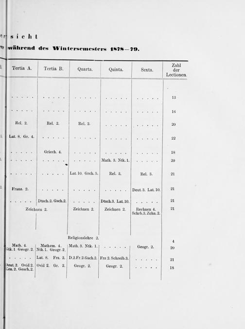 V Zahl ... Tertia A. Tertia B. Quarta.(Quinta. Sexta. der Lectionen. . 13 . 16 Rel. 2. Rel. 2. Rel. 2. 20 Lat. 8. Gr. 4. 22 . Griech. 4. 18 .... Math. 3. Ntk. 1. 20 2 . Lat. 10. Grch. 5. Rel. 3. Rel. 3. 21 Franz. 2. Deut. 3. Lat. 10. 21 . Dtsch. 2. Gsch. 2. Dtsch. 3. Lat. 10. 21 Zei 2. Zeichnen 2. Zeichnen 2. Rechnen 4. 21 Lehnen e Schrb. 3. Zchn. 2. Religionslehre 2. 4 Math. 4. Mathem. 4. Math. 3. Ntk. 1. Geogr. 2. 20 ſtk. 1. Geogr. 2. Ntk. 1. Geogr. 2. . Lat. 8. Frz. 2. D. 2. Fr. 2. Gsch. 2. Frz. 2. Schreib. 3. 21 heut. 2. Ovid 2. Ovid 2. Gr. 2. Geogr. 2. Geogr. 2. 18 Cen. 2. Gesch. 2.