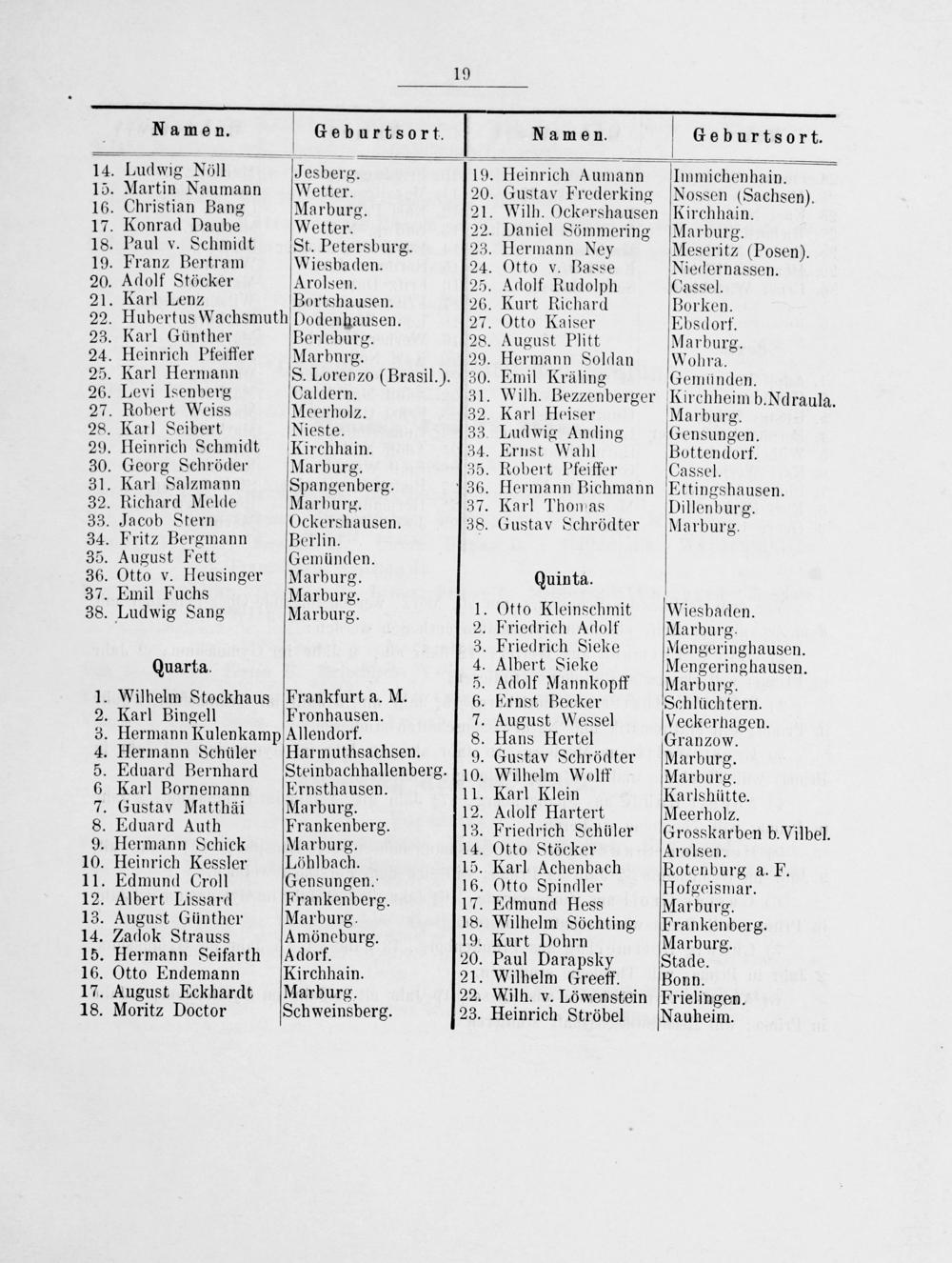 Wiesbaden. Marburg. Mengeringhausen. Mengeringhausen. Marburg. Schlüchtern. Veckerhagen. Granzow. Marburg. Marburg. Karlshütte. Meerholz. Grosskarben b. Vilbel. Arolsen. Rotenburg a. F. Hofgeismar. Marburg. Frankenberg. Marburg.