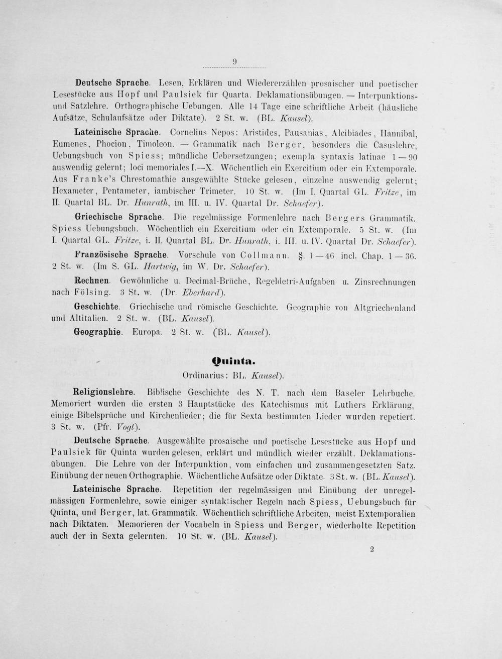 Deutsche Sprache. Ausgewählte prosaische und poetische Lesestücke aus Hopf und Paulsiek für Quinta wurden gelesen, erklärt und mündlich wieder erzählt. Deklamations- übungen. Die Lehre von der Interpunktion, vom einfachen und zusammengesetzten Satz. Einübung der neuen Orthographie. Wöchentliche Aufsätze oder Diktate. 3 St. W.(BL. Kausel).