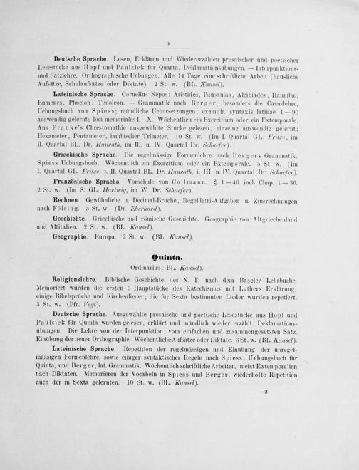Lateinische Sprache. Repetition der regelmässigen und Einübung der unregel- mässigen Formenlehre, sowie einiger syntaktischer Regeln nach Spiess, Uebungsbuch für Quinta, und Berger, lat. Grammatik. Wöchentlich schriftliche Arbeiten, meist Extemporalien nach Diktaten. Memorieren der Vocabeln in Spiess und Berger, wiederholte Repetition auch der in Sexta gelernten. 10 St. w.(BL. Kausel).