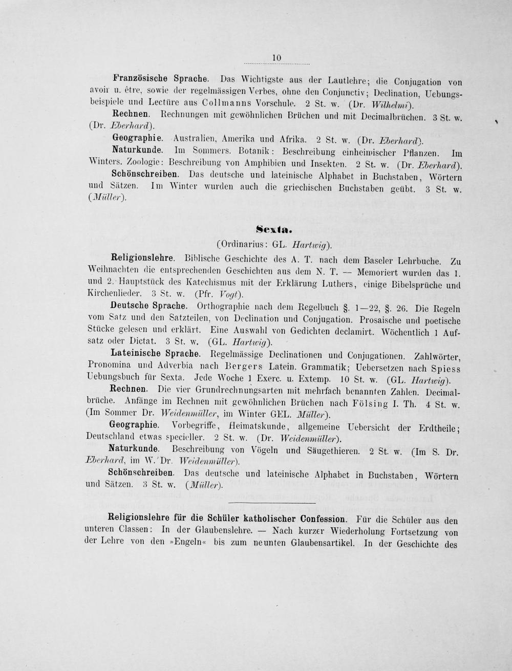 Lateinische Sprache. Regelmässige Declinationen und Conjugationen. Zahlwörter, Pronomina und Adverbia nach Bergers Latein. Grammatik; Uebersetzen nach Spiess Uebungsbuch für Sexta. Jede Woche 1 Exerc. u. Extemp. 10 St. w.(GL. Hartawig).