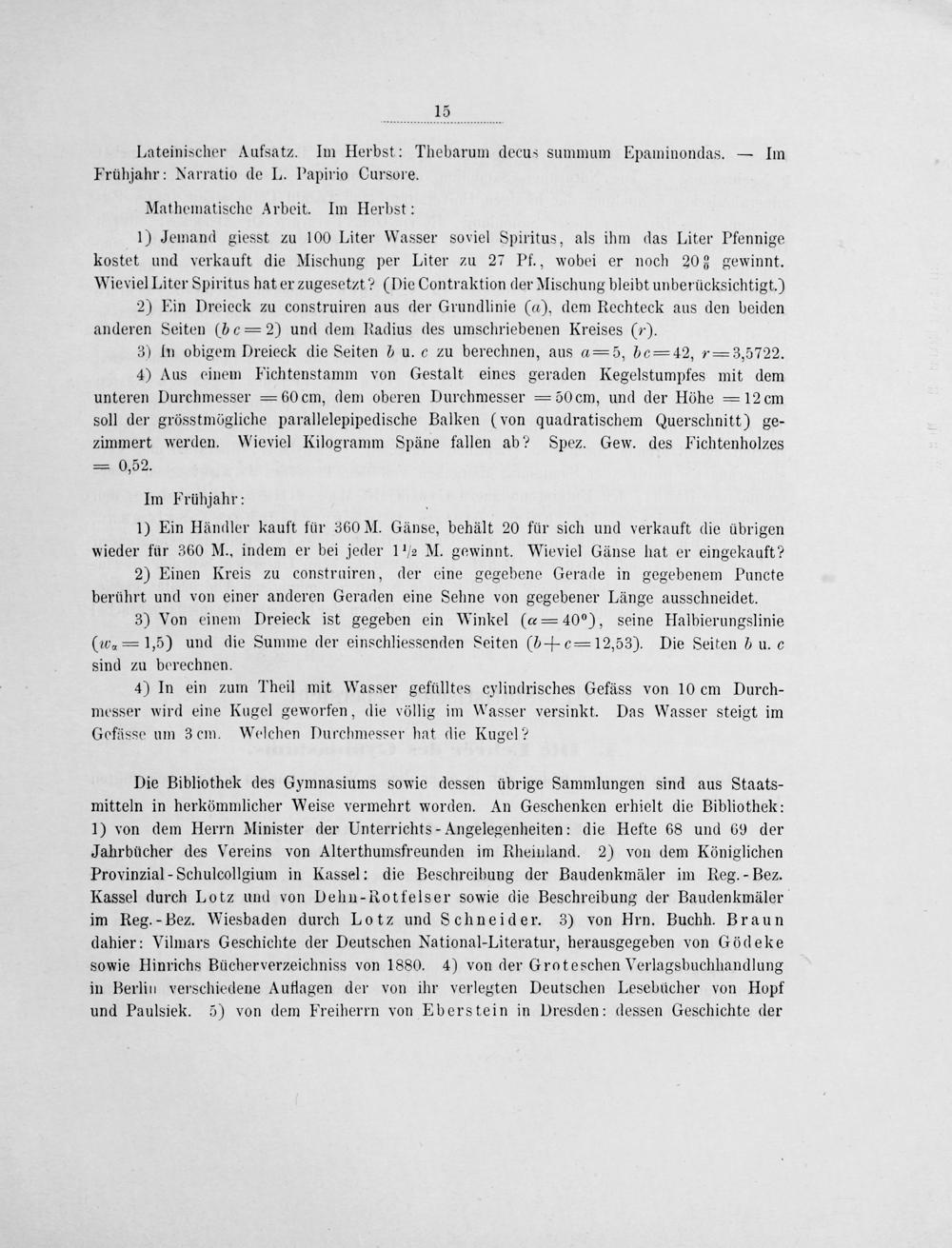 Die Bibliothek des Gymnasiums sowie dessen übrige Sammlungen sind aus Staats- mitteln in herkömmlicher Weise vermehrt worden. An Geschenken erhielt die Bibliothek: 1) von dem Herrn Minister der Unterrichts-Angelegenheiten: die Hefte 68 und 69 der Jahrbücher des Vereins von Alterthumsfreunden im Rheinland. 2) von dem Königlichen Provinzial-Schulcollgium in Kassel: die Beschreibung der Baudenkmäler im Reg.-Bez. Kassel durch Lotz und von Dehn-Rotfelser sowie die Beschreibung der Baudenkmäler im Reg.-Bez. Wiesbaden durch Lotz und Schneider. 3) von Hrn. Buchh. Braun dahier: Vilmars Geschichte der Deutschen National-Literatur, herausgegeben von Gödeke sowie Hinrichs Bücherverzeichniss von 1880. 4) von der Groteschen Verlagsbuchhandlung in Berlin verschiedene Auflagen der von ihr verlegten Deutschen Lesebücher von Hopf und Paulsiek. 5) von dem Freiherrn von Eberstein in Dresden: dessen Geschichte der