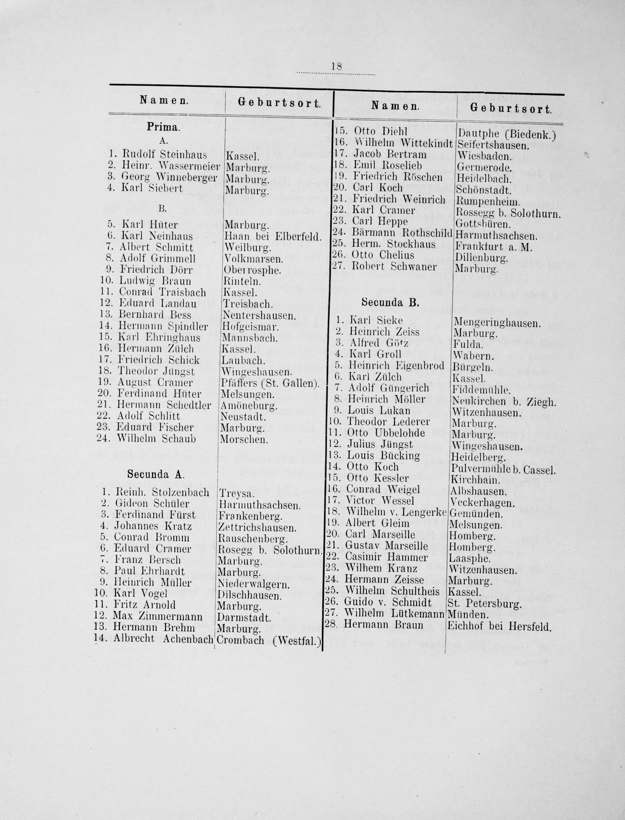 Namen. b Geburtsort. Namen. b Geburtsort. Prima. 15. Otto Diehl Dautphe(Biedenk.) 4. 16. Wilhelm Wittekindt Seifertshausen. ; 17. Jacob Bertram Wiesbaden. 4— Vuneft Wleinpans,.Fassel. 18. Emil Roselieb Germerode. Heinr. Wassermeier Marburg. 19. Friedrich Rhsch Heidelbach 3. Georg Winneberger Marburg. 95. An irngen lschen Eiaelhacn. .. 8 20. Carl Koch Schönstadt 4. Karl Siebert Marburg. Fip p. 8 21. Friedrich Weinrich Rumpenheim. B. 22. Karl Cramer Rossegg b. Solothurn. — 23. Carl Heppe Gottshbüren. 5. Karl Hüter Marburg. 24. Bärmann Rothschild Harmuthsachsen. 6. Karl Neinhaus Haan bei Elberfeld. 25. Herm. Stockhaus Prankfurt a. M 7. Albert Schmitt Weilburg. 26. Otto Chelius Dillenburg 8. Adolf Grimmell Volkmarsen. 27. Robert Schwaner Marburg, 9. PFriedrich Dörr Oberrosphe. 5 10. Ludwig Braun inete 11. Conrad Traisbach Kassel.— 12. Eduard Landau Treisbach. Secunda B. 13. Bernhard Bess Nentershausen. 1. Karl Sieke Mengeringhausen. 14. Hermann Spindler flofgeismar. 2. Heinrich Zeiss Marburg. 15. Karl Ehringhaus Mannsbach. 3. Alfred Göt⸗ Fulda. 16. Hermann Zülch Kassel. 4. Karl Groll Wabern. 17. Friedrich Schick Laubach. 5. Heinrich Eigenbrod Bürgeln. 18. Theodor Jüngst Wingeshausen. 6. Karl Zülch Kassel. 19. August Cramer Pfäffers(St. Gallen). 7. Adolf Güngerich Eiddemühle. 20. Perdinand Hüter Melsungen. 8. Heinrich Möller Neukirchen b. Ziegh. 21. Hermann Schedtler Amöneburg. 9. Louis Lukan Witzenhausen. 22. Adolf Schlitt Neustadt. 10. Theodor Lederer Mlarburg. 23. Eduard Fischer MMarburg- 11. Otto Ubbelohde Marburg. 24. Wilhelm Schaub Morschen. 12. Julius Jüngst, Wingeshausen. 13. Louis Bücking Heidelberg. 14. Otto Koch Pulvermühle b. Cassel. Secunda A. 15. Otto Kessler kirchhann. .— ſen 16. Conrad Weigel Albshausen. 1. Reinh. Stolzenbach(Preysa. 17. Vietor Wessel Veckerhagen. 2. Gideon Schüler Harmuthsachsen. 18. Wilhelm v. Lengerke Gemünden. 3. Ferdinand Fürst Frankenberg. 19. Albert Gleim Melsunaen. 4. Johannes Kratz Zettrichshausen. 20. Carl Marseille Homberg. 5. Conrad Bromm Rauschenberg. 21. Gustav Marseille Homberg. 6. Eduard Cramer Rosegg b. Solothurn. 22. Casimir Hammer Laasphe. 2. Pranz Bersch Marburg. 23. Wilhem Kranz Witzenhausen. 8. Paul Ehrhardt Marburg. 24. Hermann Zeisse Marburg. 9. Heinrich Müller Niederwalgern. 25. Wilhelm Schultheis Kassel. 10. Karl Vogel Dilschhausen. 26. Guido v. Schmidt St. Petersburg. 11. Pritz Arnold Marburg. 27. Wilhelm Lütkemann Münden. 12. Max Zimmermann Darmstadt. 28. Hermann Braun Eichhof bei Hersfeld. 13. Hermann Brehm Marburg. 14. Albrecht Achenbach Crombach(Westfal.)