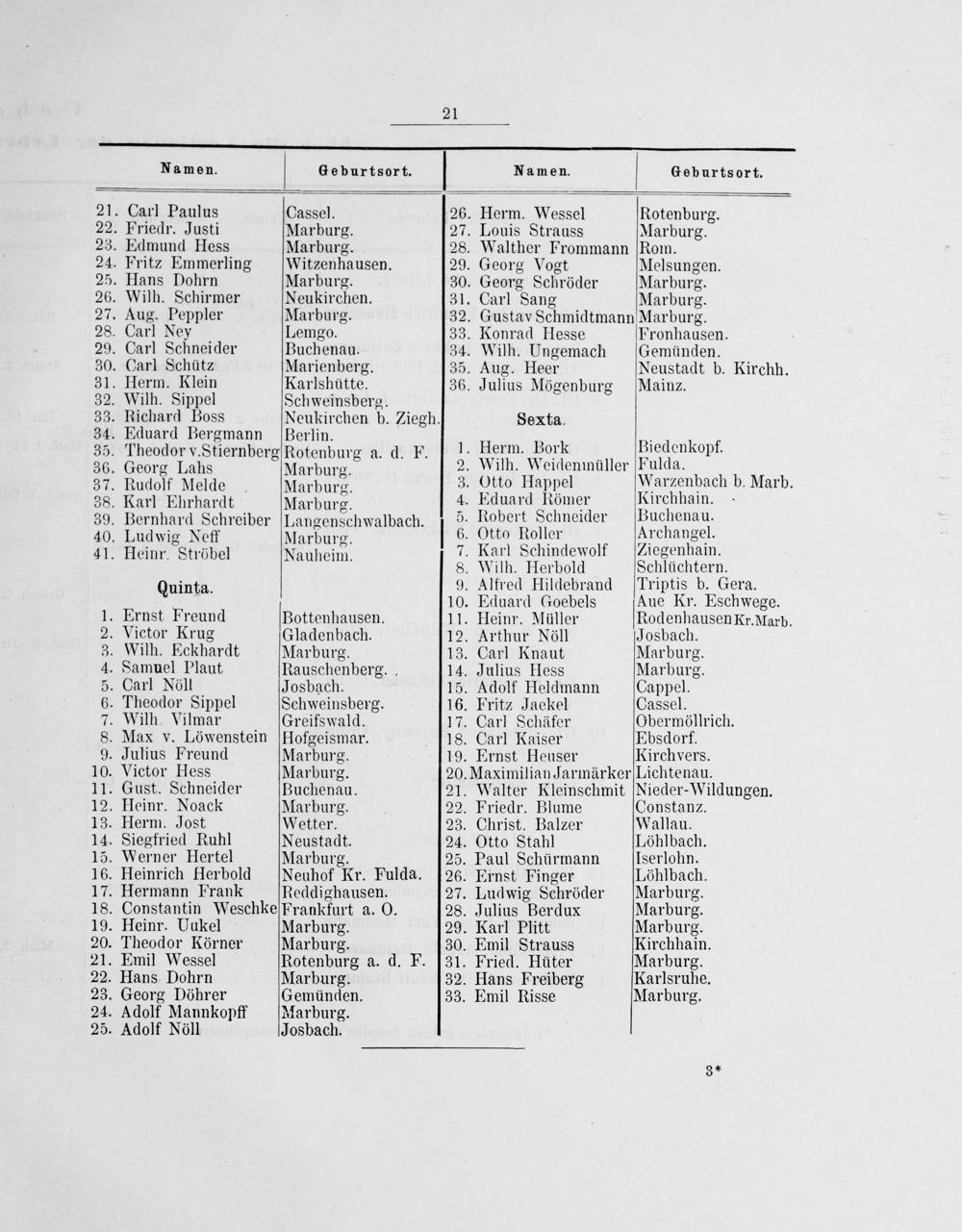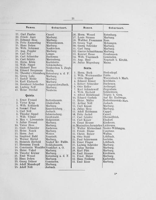 21. Carl Paulus Cassel. 26. Herm. Wessel Rotenburg. 22. Friedr. Justi Marburg. 27. Louis Strauss Marburg. 23. Edmund Hess Marburg. 28. Walther Frommann Rom. 24. Fritz Emmerling Witzenhausen. 29. Georg Vogt Melsungen. 25. Hans Dohrn Marburg. 30. Georg Schröder Marburg. 26. Wilh. Schirmer Neukirchen. 31. Carl Sang Marburg. 27. Aug. Peppler Marburg. 32. Gustav Schmidtmann Marburg. 28. Carl Ney Lemgo. 33. Konrad Hesse Fronhausen. 29. Carl Schneider Buchenau. 34. Wilh. Ungemach Gemünden. 30. Carl Schütz Marienberg. 35. Aug. Heer Neustadt b. Kirchh. 31. Herm. Klein Karlshütte. 36. Julius Mögenburg Mainz. 32. Wilh. Sippel Schweinsberg. 33. Richard Boss Neukirchen b. Ziegh. Sexta. 34. Eduard Bergmann Berlin.—. 35. Theodor v.Stiernberg Rotenburg a. d. F.1- Herm. Bork. Biedenkopf. 36. Georg Lahs Marburg. 2. Wilh. Weidenmüller Pulda. 37. Rudolf Melde Marburg. 3. Otto Happel Warzenbach b. Marb. 38. Karl Ehrhardt Marburg. 4. Eduard Römer Kirchhain. 39. Bernhard Schreiber Langenschwalbach. 5. Robert Schneider Buchenau. 40. Ludwig Neff Marburg. 6. Ottc Kllen t obande