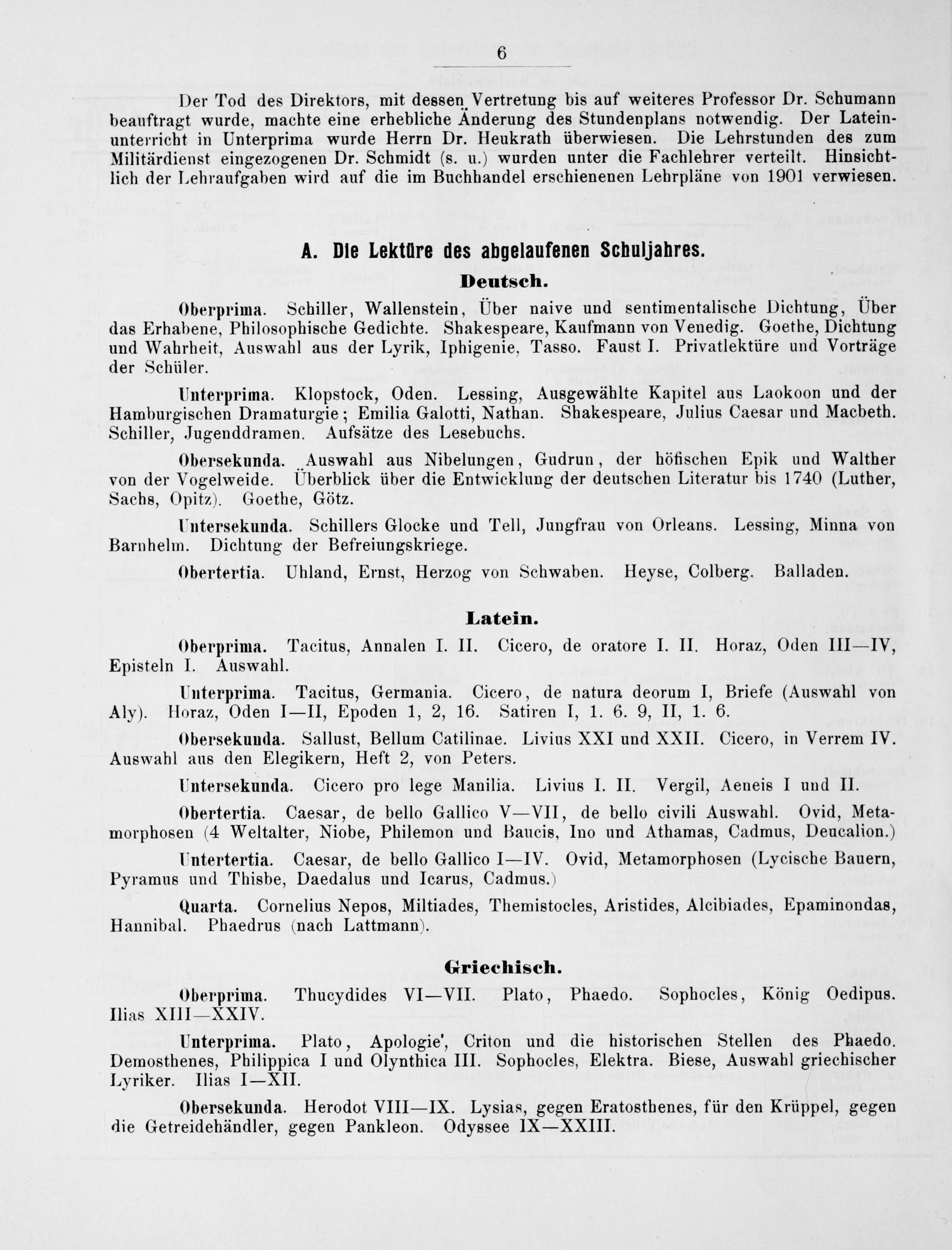 6 Der Tod des Direktors, mit dessen Vertretung bis auf weiteres Professor Dr. Schumann beauftragt wurde, machte eine erhebliche Anderung des Stundenplans notwendig. Der Latein- unterricht in Unterprima wurde Herrn Dr. Heukrath überwiesen. Die Lehrstunden des zum Militärdienst eingezogenen Dr. Schmidt(s. u.) wurden unter die Fachlehrer verteilt. Hinsicht- lich der Lehraufgaben wird auf die im Buchhandel erschienenen Lehrpläne von 1901 verwiesen.