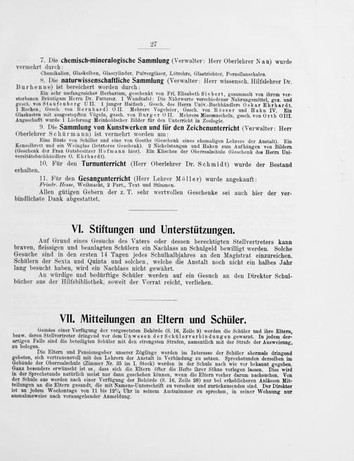Eine Büste von Schiller und eine von Goethe(Geschenk eines ehemaligen Lehrers der Anstalt). Ein Konsolbrett und ein Weinglas(letzteres Geschenk). 2 Nickelstangen und Haken zum Aufhängen von Bildern (Geschenk der Frau Gutsbesitzer Hofmann hier). Ein Klischee der Oberrealschule(Geschenk des Herrn Uni- versitätsbuchhändlers O. Ehrhardt).