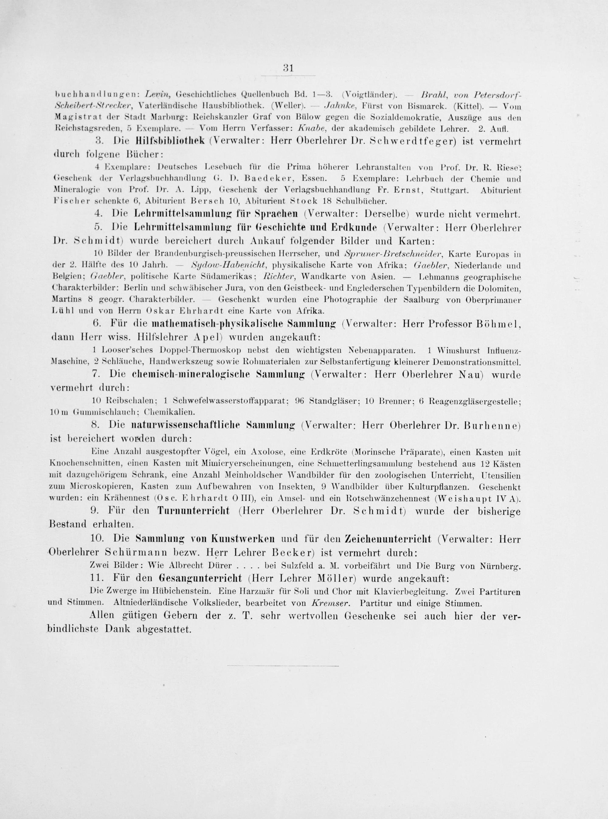 buchhandlungen: Lepin, Geschichtliches Quellenbuch Bd. 1— 3.(Noigtländer). Brahl, von Petersdorf- Scheibert-Strecker, Vaterländische Ilausbibliothek.(Weller). Jahnke, Fürst von Bismarck.(Kittel).— Vom Magistrat der Stadt Marburg: Reichskanzler Graf von Bülow gegen die Sozialdemokratie, Auszüge aus den Reichstagsreden, 5 Exemplare. Vom Herrn Verfasser: Knabe, der akademisch gebildete Lehrer. 2. Aufl.