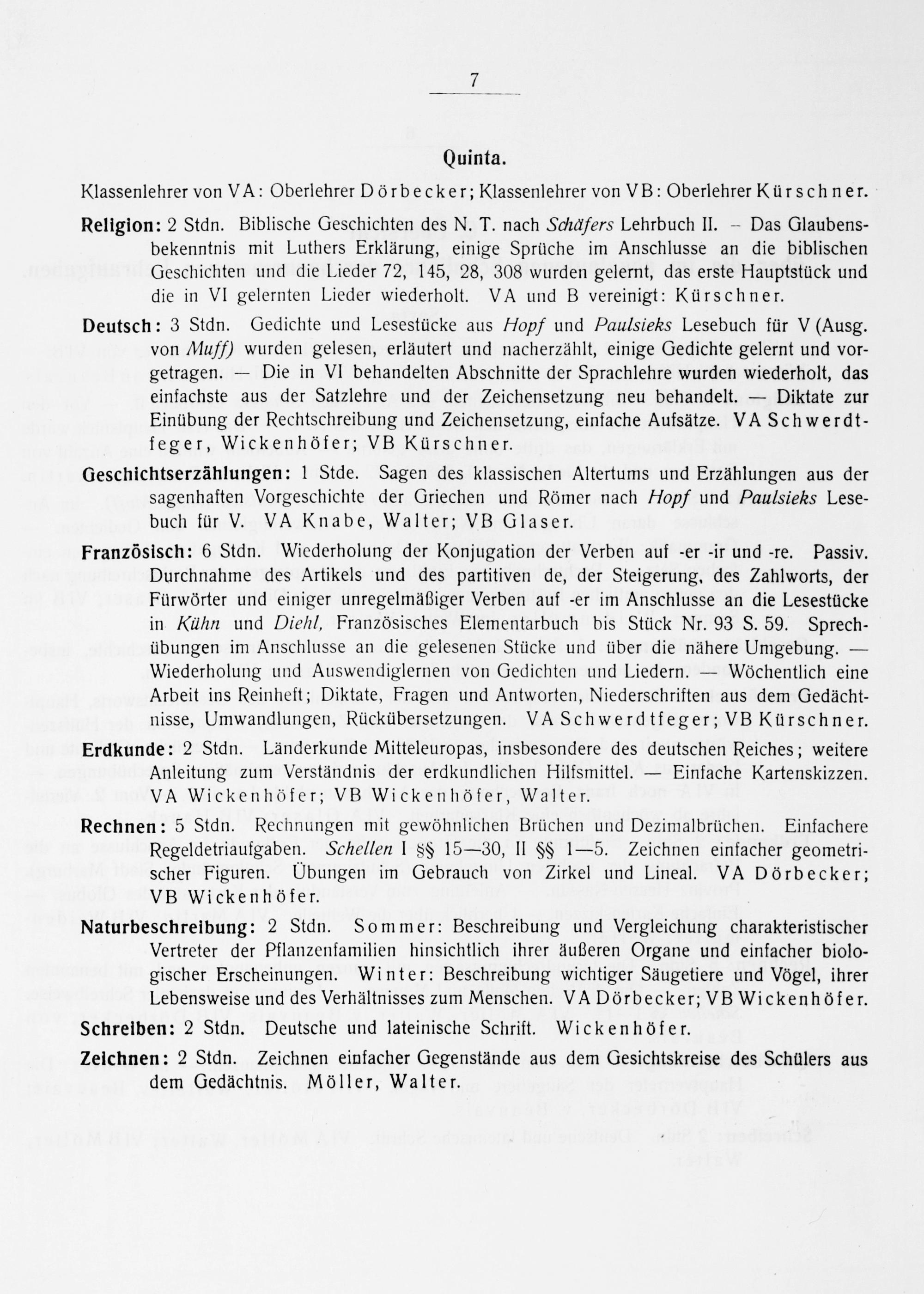 Deutsch: 3 Stdn. Gedichte und Lesestücke aus Hopf und Paulsiehs Lesebuch für V(Ausg. von Muff) wurden gelesen, erläutert und nacherzählt, einige Gedichte gelernt und vor- getragen.— Die in VI behandelten Abschnitte der Sprachlehre wurden wiederholt, das einfachste aus der Satzlehre und der Zeichensetzung neu behandelt.— Diktate zur Einübung der Rechtschreibung und Zeichensetzung, einfache Aufsätze. VA Schwerdt- feger, Wickenhöfer; VB Kürschner.