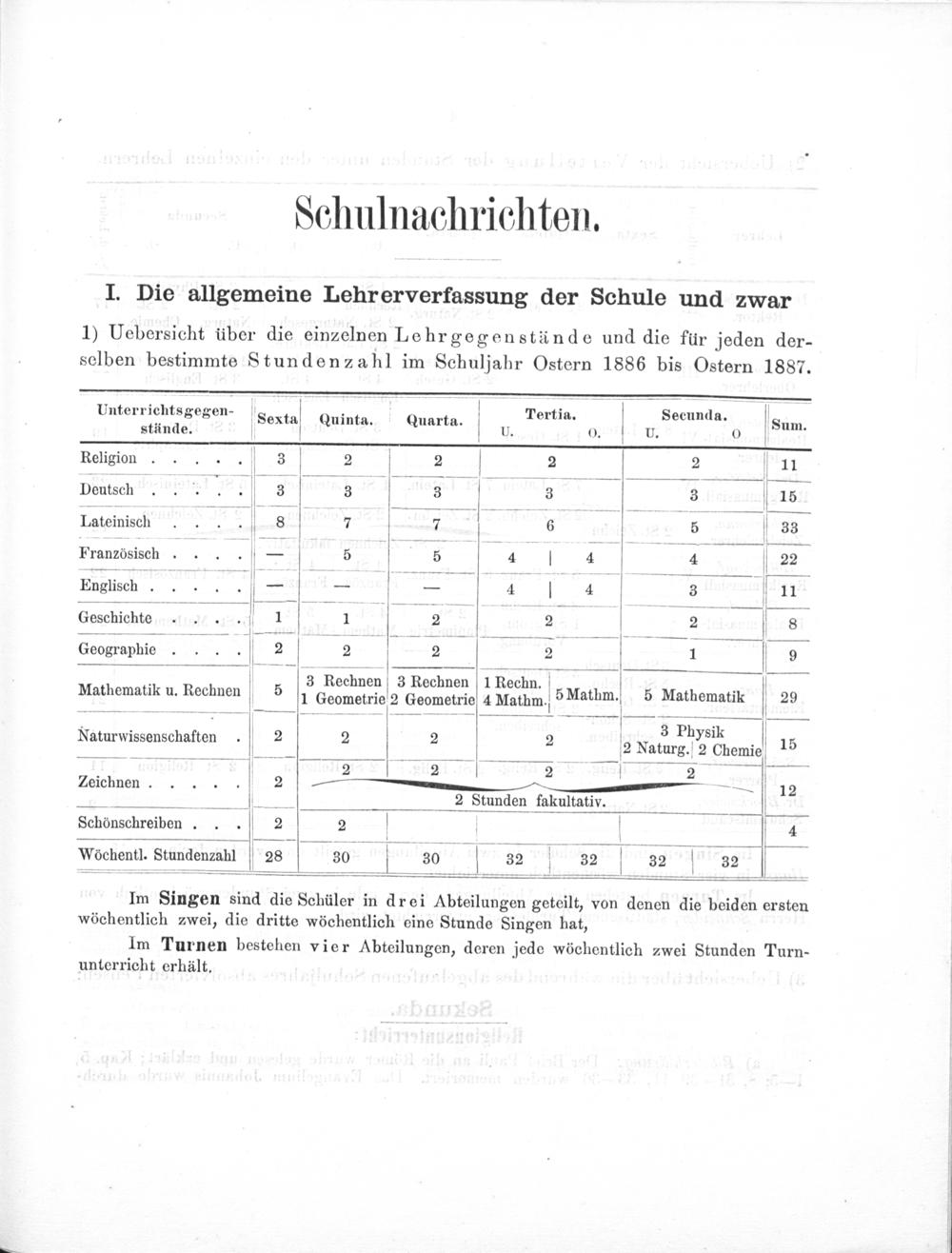 1) Uebersicht über die einzelnen Lehrgegenstände und die für jeden der- selben bestimmte Stundenzahl im Schuljahr Ostern 1886 bis Ostern 1887.