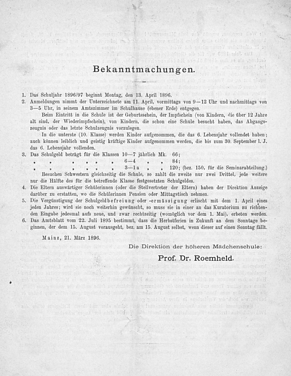 Das Schuljahr 1896/97 beginnt Montag, den 13. April 1896. Anmeldungen nimmt der Unterzeichnete am 11. April, vormittags von 9— 12 Uhr und nachmittags von 3— 5 Uhr, in seinem Amtszimmer im Schulhause(ebener Erde) entgegen.