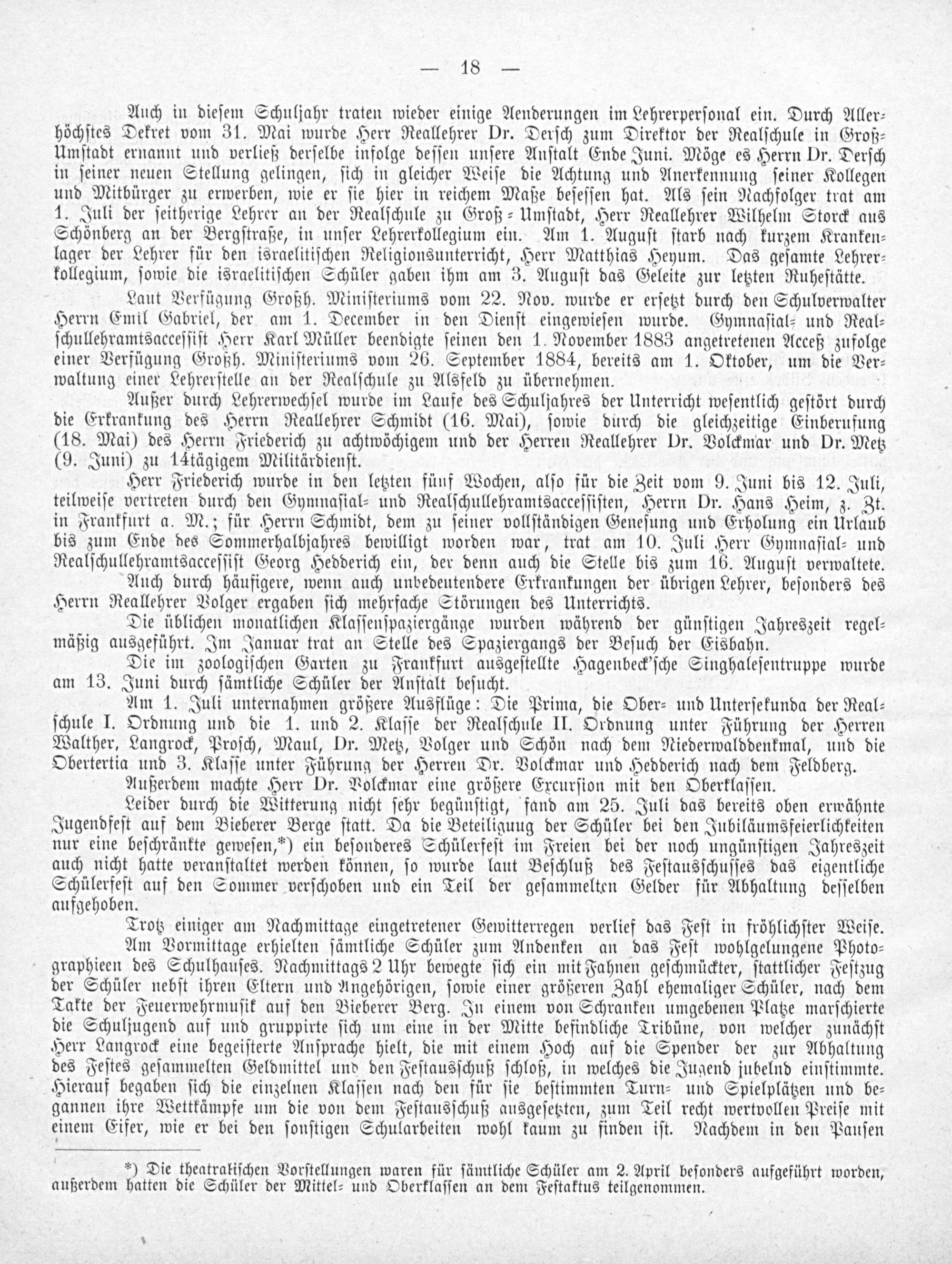 Laut Verfügung Großh. Miniſteriums vom 22. Nov. wurde er erſetzt durch den Schulverwalter Herrn Emil Gabriel, der am 1. December in den Dienſt eingewieſen wurde. Gymnaſial-⸗ und Real⸗ ſchullehramtsacceſſiſt Herr Karl Müller beendigte ſeinen den 1. November 1883 angetretenen Acceß zufolge einer Verfügung Großh. Miniſteriums vom 26. September 1884, bereits am 1. Oktober, um die Ver⸗ waltung einer Lehrerſtelle an der Realſchule zu Alsfeld zu übernehmen. 1—