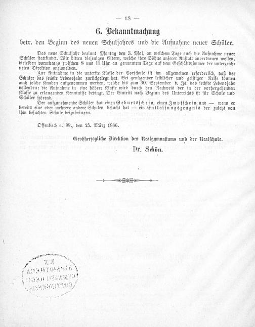 6. Bekanntmachung betr. den Beginn des neuen Schuljahres und die Aufnahme neuer Schüler.