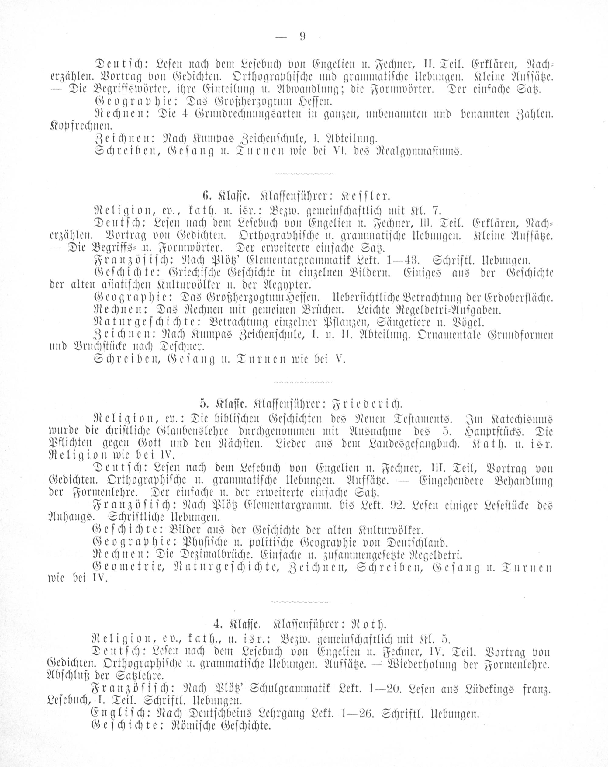 Religion, ev.: Die bibliſchen Geſchichten des Neuen Teſtaments. Im Katechismus wurde die chriſtliche Glaubenslehre durchgenommen mit Ausnahme des 5. Hauptſtücks. Die Pflichten gegen Gott und den Nächſten. Lieder aus dem Landesgeſangbuch. Kath. u. isr. Religion wie bei lV.