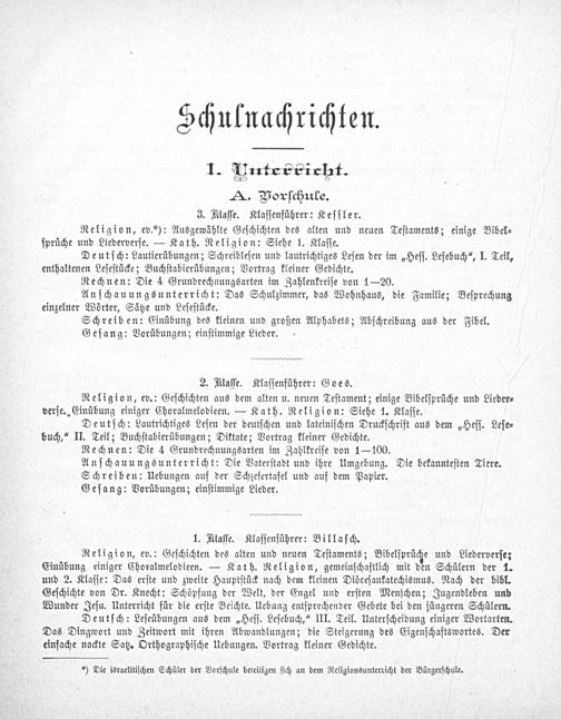 1. Klaſſe. Klaſſenſührer: Billaſch. Religion, ev.: Geſchichten des alten und neuen Teſtaments; Bibelſprüche und Liederverſe; Einübung einiger Choralmelodieen.— Kath. Religion, gemeinſchaftlich mit den Schülern der 1. und 2. Klaſſe: Das erſte und zweite Hauptſtück nach dem kleinen Diöceſankatechismus. Nach der bibl. Geſchichte von Dr. Knecht: Schöpfung der Welt, der Engel und erſten Menſchen; Jugendleben und Wunder Jeſu. Unterricht für die erſte Beichte. Uebung entſprechender Gebete bei den jüngeren Schülern. Deutſch: Leſeübungen aus dem„Heſſ. Leſebuch,“ III. Teil. Unterſcheidung einiger Wortarten. Das Dingwort und Zeitwort mit ihren Abwandlungen; die Steigerung des Eigenſchaftswortes. Der einfache nackte Satz. Orthographiſche Uebungen. Vortrag kleiner Gedichte.