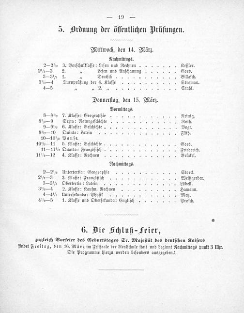 Nachmittags. 2— 2 ½ 3. Vorſchulklaſſe: Leſen und Rechnen....... Keſſler. 2 ½— 3 2.„ Leſen und Anſchauung...... Goes. 3— 3 ½ 1.„ Deutſch........... Bitklaſch. 3 ½— 4 Turnprüfung der 4. Klaſſe.......... Stroman. 4—5„„ 2.„.......... Stahl.