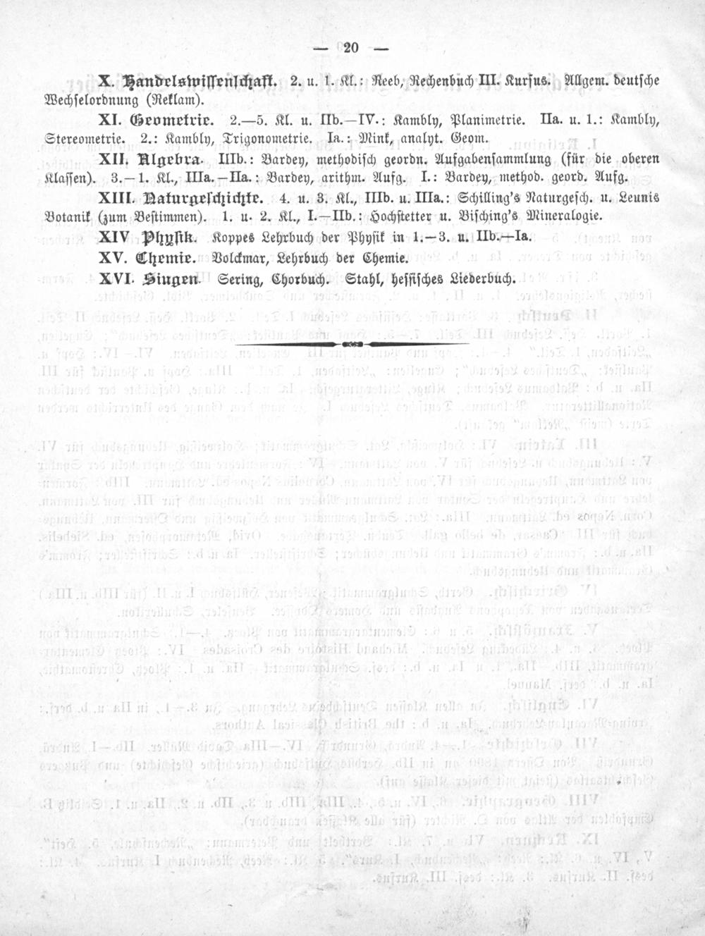 XI. Geometrie. 2.— 5. Kl. u. IIb.—IV.: Kambly, Planimetrie. IIa. u. 1.: Kambly, Stereometrie. 2.: Kambly, Trigonometrie. Ja.: Mink, analyt. Geom.