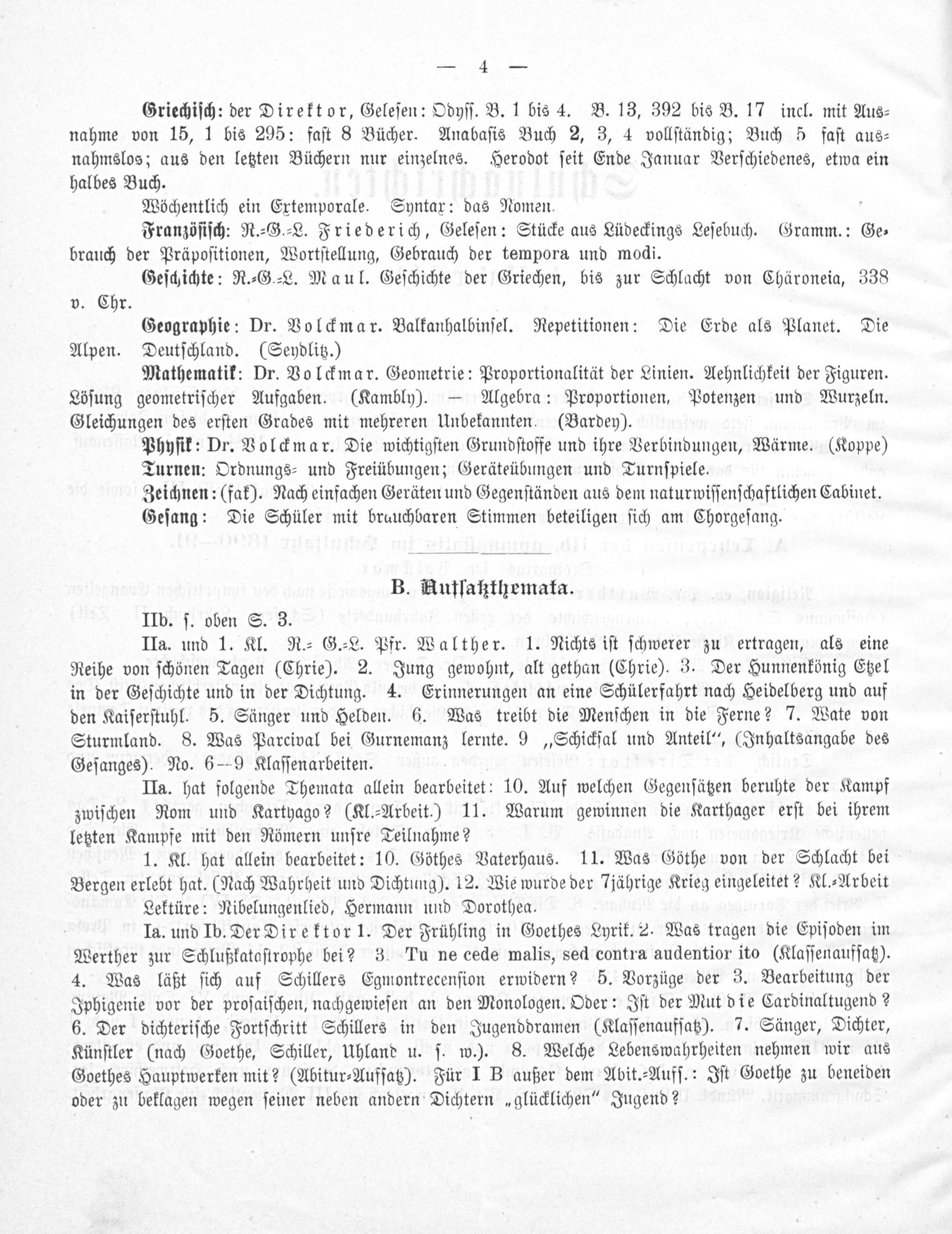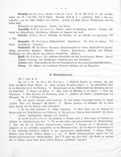 Ia. und Ib. Der Direktor. Der Frühling in Goethes Lyrik. 2. Was tragen die Epiſoden im Werther zur Schlußkataſtrophe bei? 3. Tu ne cede malis, sed contra audentior ito(Klaſſenaufſatz). 4. Was läßt ſich auf Schillers Egmontrecenſion erwidern? 5. Vorzüge der 3. Bearbeitung der Iphigenie vor der proſaiſchen, nachgewieſen an den Monologen. Oder: Iſt der Mut die Cardinaltugend? 6. Der dichteriſche Fortſchritt Schillers in den Jugenddramen(Klaſſenaufſatz). 7. Sänger, Dichter, Künſtler(nach Goethe, Schiller, Uhland u. ſ. w.). 8. Welche Lebenswahrheiten nehmen wir aus Goethes Hauptwerken mit?(Abitur⸗Aufſatz). Für I B außer dem Abit.⸗Aufſ.: Iſt Goethe zu beneiden oder zu beklagen wegen ſeiner neben andern Dichtern„glücklichen“ Jugend?