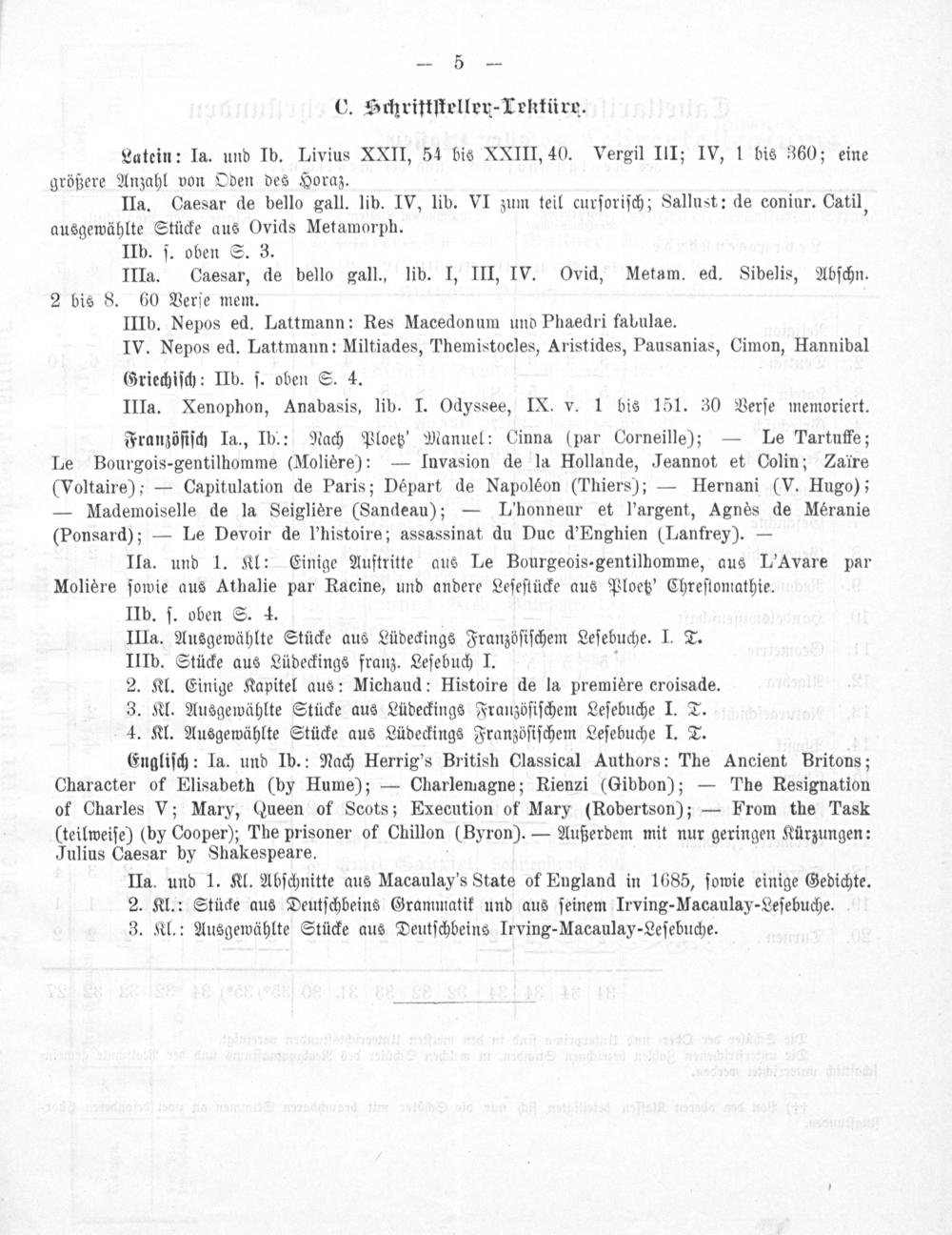Engliſch: Ia. und Ib.: Nach Herrig's British Classical Authors: The Ancient Britons; Character of Elisabeth(by Hume);— Charlemagne; Rienzi(Gibbon);— The Resignation of Charles V; Mary, Queen of Scots; Execution of Mary(Robertson);— From the Task (teilweiſe)(by Cooper); The prisoner of Chillon(Byron).— Außerdem mit nur geringen Kürzungen: Julius Caesar by Shakespeare.