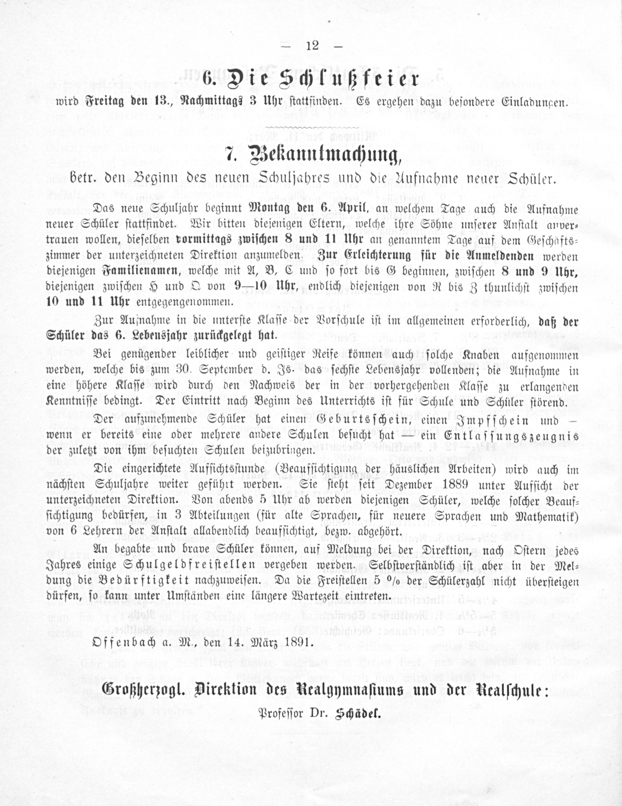 Das neue Schuljahr beginnt Montag den 6. April, an welchem Tage auch die Aufnahme neuer Schüler ſtattfindet. Wir bitten dieienigen Eltern, welche ihre Söhne unſerer Anſtalt anver⸗ trauen wollen, dieſelben vormittags zwiſchen 8 und 11 Uhr an genanntem Tage auf dem Geſchäfts⸗ zimmer der unterzeichneten Direktion anzumelden. Zur Erleichterung für die Anmeldenden werden diejenigen Familienamen, welche mit A, B, C und ſo fort bis G beginnen, zwiſchen 8 und 9 Uhr, diejenigen zwiſchen Hund Q von 9—10 Uhr, endlich diejenigen von R bis Z thunlichſt zwiſchen 10 und 11 Uhr entgegengenommen.