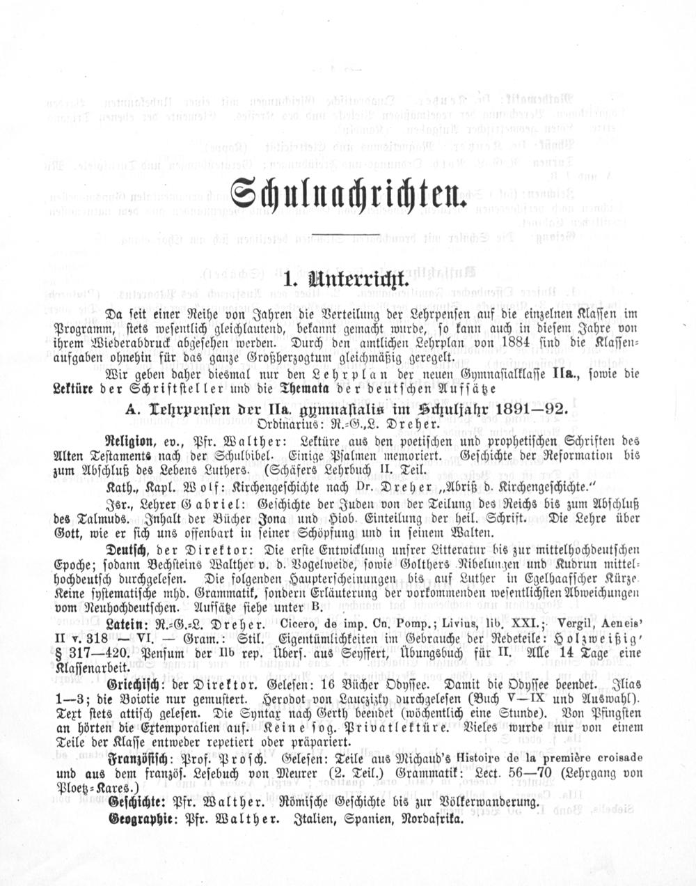 Da ſeit einer Reihe von Jahren die Verteilung der Lehrpenſen auf die einzelnen Klaſſen im Programm, ſtets weſentlich gleichlautend, bekannt gemacht wurde, ſo kann auch in dieſem Jahre von ihrem Wiederabdruck abgeſehen werden. Durch den amtlichen Lehrplan von 1884 ſind die Klaſſen⸗ aufgaben ohnehin für das ganze Großherzogtum gleichmäßig geregelt.