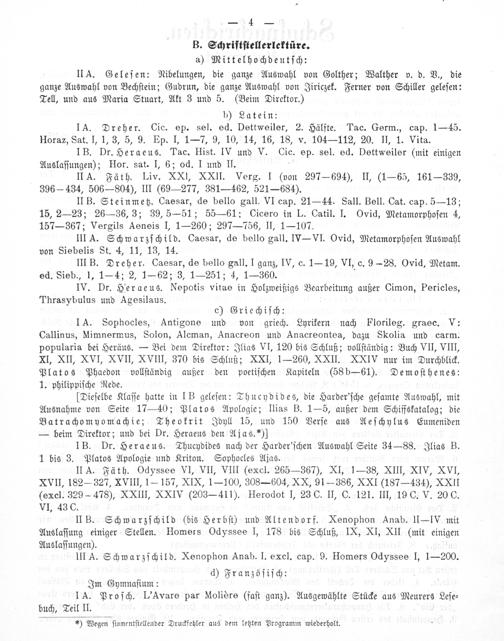 [Dieſelbe Klaſſe hatte in IB geleſen: Thucydides, die Harder'ſche geſamte Auswahl, mit Ausnahme von Seite 17—40; Platos Apologie; Ilias B. 1—5, außer dem Schiffskatalog; die Batrachomyomachie; Theokrit Idyll 15, und 150 Verſe aus Aeſchylus Eumeniden — beim Direktor; und bei Dr. Heraeus den Ajas.*)]