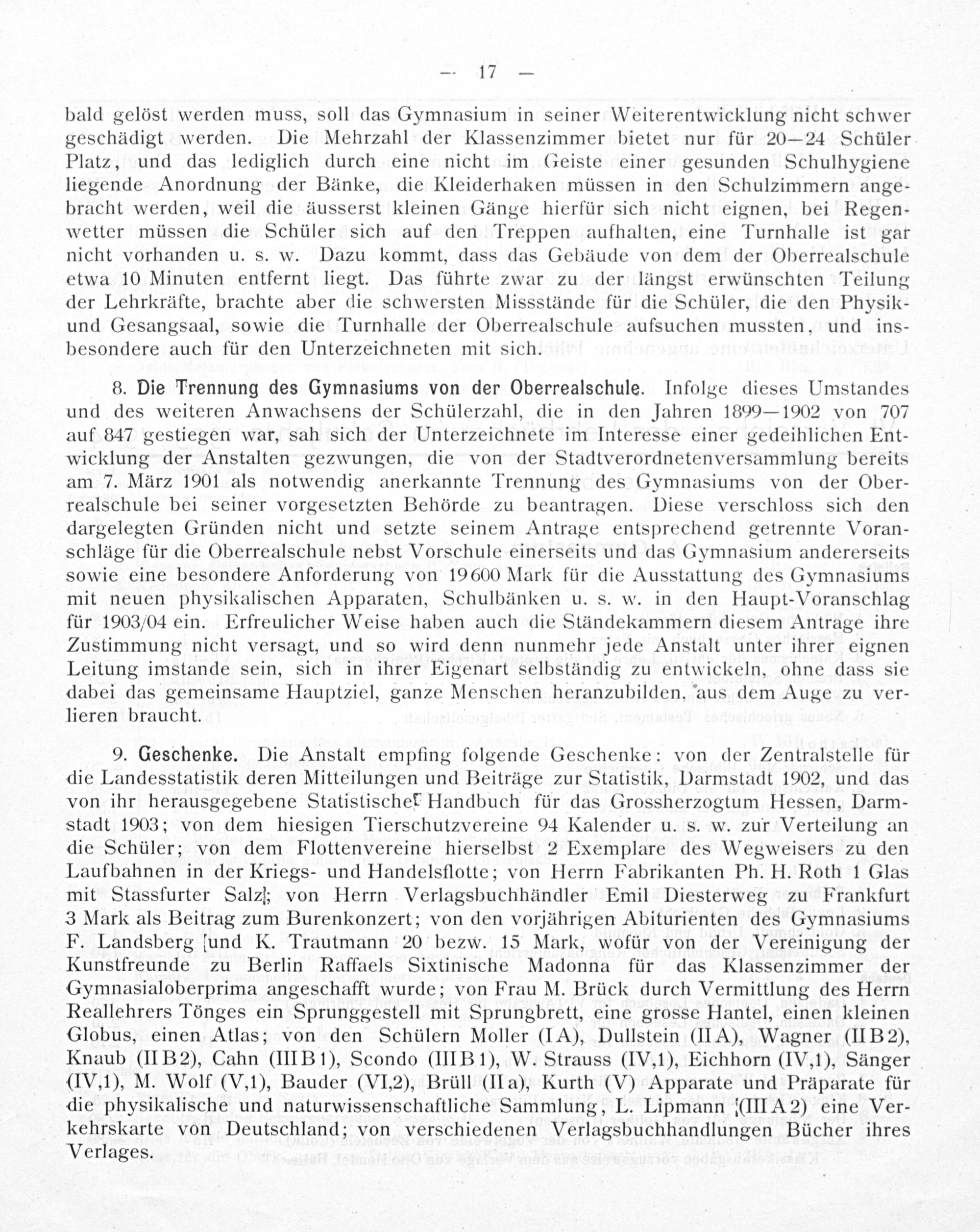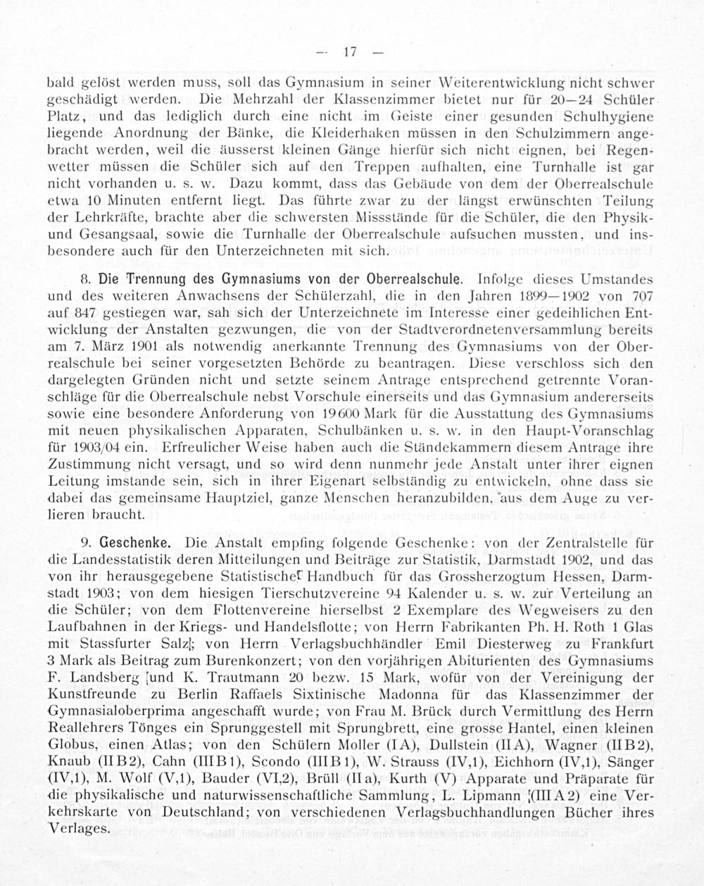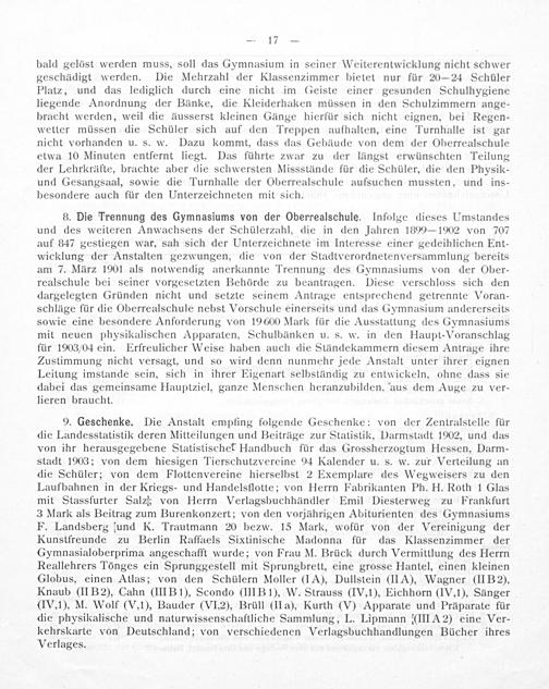 9. Geschenke. Die Anstalt empfing folgende Geschenke: von der Zentralstelle für die Landesstatistik deren Mitteilungen und Beiträge zur Statistik, Darmstadt 1902, und das von ihr herausgegebene Statistischet Handbuch für das Grossherzogtum Hessen, Darm- stadt 1903; von dem hiesigen Tierschutzvereine 94 Kalender u. s. w. zur Verteilung an die Schüler; von dem Flottenvereine hierselbst 2 Exemplare des Wegweisers zu den Laufbahnen in der Kriegs- und Handelsflotte; von Herrn Fabrikanten Ph. H. Roth 1 Glas mit Stassfurter Salzz von Herrn Verlagsbuchhändler Emil Diesterweg zu Frankfurt 3 Mark als Beitrag zum Burenkonzert; von den vorjährigen Abiturienten des Gymnasiums F. Landsberg lund K. Trautmann 20 bezw. 15 Mark, wofür von der Vereinigung der Kunstfreunde zu Berlin Raffaels Sixtinische Madonna für das Klassenzimmer der Gymnasialoberprima angeschafft wurde; von Frau M. Brück durch Vermittlung des Herrn Reallehrers Tönges ein Sprunggestell mit Sprungbrett, eine grosse Hantel, einen kleinen Globus, einen Atlas; von den Schülern Moller([A), Dullstein(IIA), Wagner(IIB 2), Knaub(II B 2), Cahn(IIIB 1), Scondo(IIIB 1), W. Strauss(IV, 1), Eichhorn(V,1), Sänger (IV, 1), M. Wolf(V,1), Bauder(VI, 2), Brüll(II a), Kurth(V) Apparate und Präparate für die physikalische und naturwissenschaftliche Sammlung, L. Lipmann(III A 2) eine Ver-