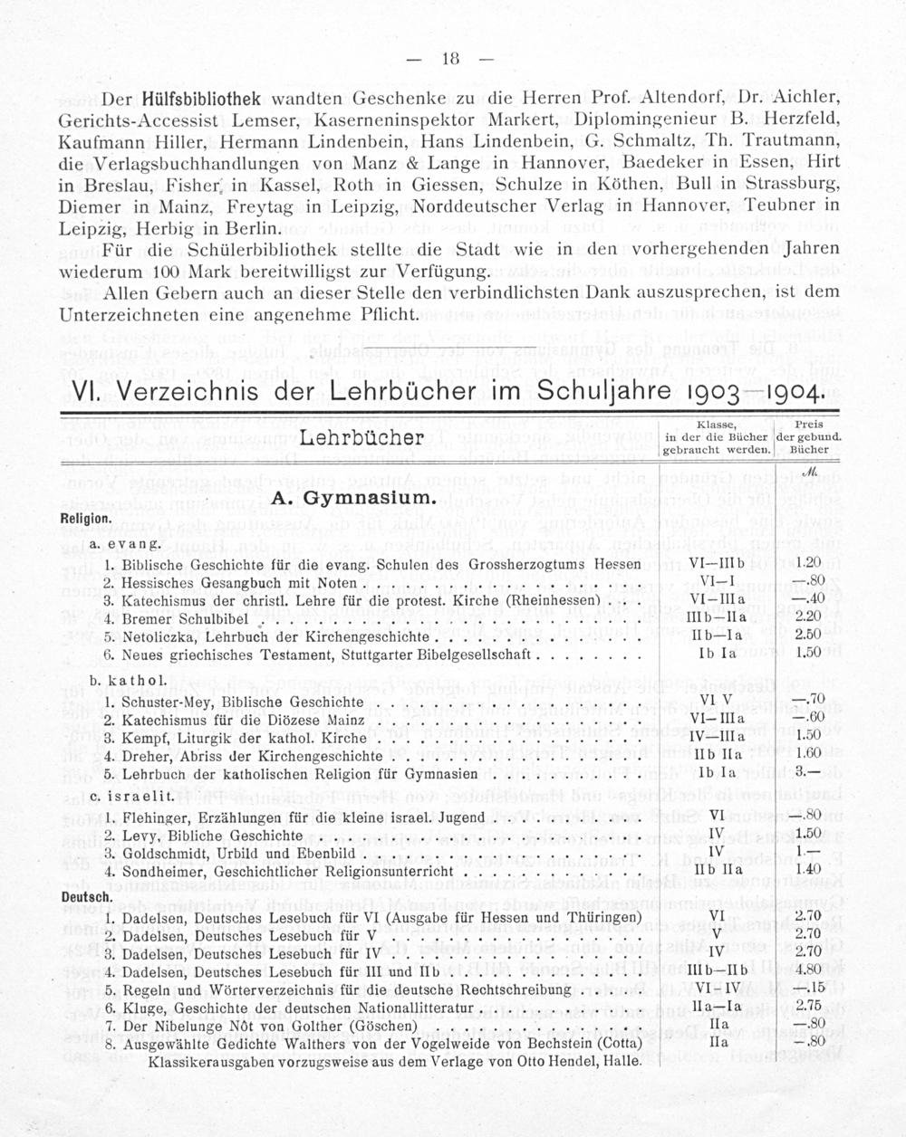 VI. Verzeichnis der Lehrbücher im Schuljahre 1903—1904.