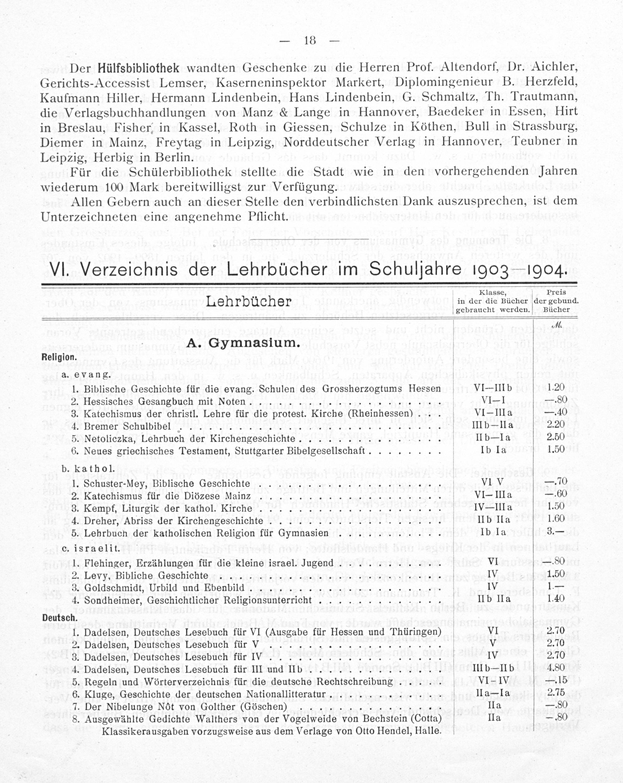 Klasse, P Lehrbüch 6T in der die Vüeher der Whazand. gebraucht werden. Bücher 2t. A. Gymnasium. Religion. V a. evang. 1. Biblische Geschichte für die evang. Schulen des Grossherzogtums Hessen VI-IIIb 1.20 2. Hessisches Gesangbuch mit Noten.................... VII—.80 3. Katechismus der christl. Lehre für die protest. Kirche(Rheinhessen)... VI-III a—. 40 4. Bremer Schulbibel.......................... IIIb= lla 2.20 5. Netoliczka, Lehrbuch der Kirchengeschichte............... IIb— Ia 2.50 6. Neues griechisches Testament, Stuttgarter Bibelgesellschaft........ Ib Ia 1.50 b. kathol. 1. Schuster-Mey, Biblische Geschichte................... VI V—. 70 2. Katechismus für die Diözese Mainz.................. VI- III a—. 60 3. Kempf, Liturgik der Kkathol. Kfircho................... IV- III a 1.50 4. Dreher, Abriss der Kirchengeschichte.................. IIb Ila 1.60 5. Lehrbuch der katholischen Religion für Gymnasien........... Ib la 3.— c. israelit. 1. Flehinger, Erzählungen für die kleine israel. Jugend........... VI—.80 2. Levy, Bibliche Geschichte....................... IV 1.50 3. Goldschmidt, Urbild und Ebenbild.................... IV 1.— 4. Sondheimer, Geschichtlicher Religionsunterricht............. IIb IIa 1.40 Deutsch. 1. Dadelsen, Deutsches Lesebuch für VI(Ausgabe für Hessen und Thüringen) VI 2.70 2. Dadelsen, Deutsches Lesebuch füf V.................. V 2.70 3. Dadelsen, Deutsches Lesebuch für IV................. IV 2.70 4. Dadelsen, Deutsches Lesebuch für III und IIb.............. IIIb— IIb 4.80 5. Regeln und Wörterverzeichnis für die deutsche Rechtschreibung..... VI= IV—. 15 6. Kluge, Geschichte der deutschen Nationallitteratur............ Il a— la 2.75 7. Der Nibelunge Nôt von Golther(Göschen).............. IIa—. 80 8. Ausgewählte Gedichte Walthers von der Vogelweide von Bechstein(Cotta) IIa—.80