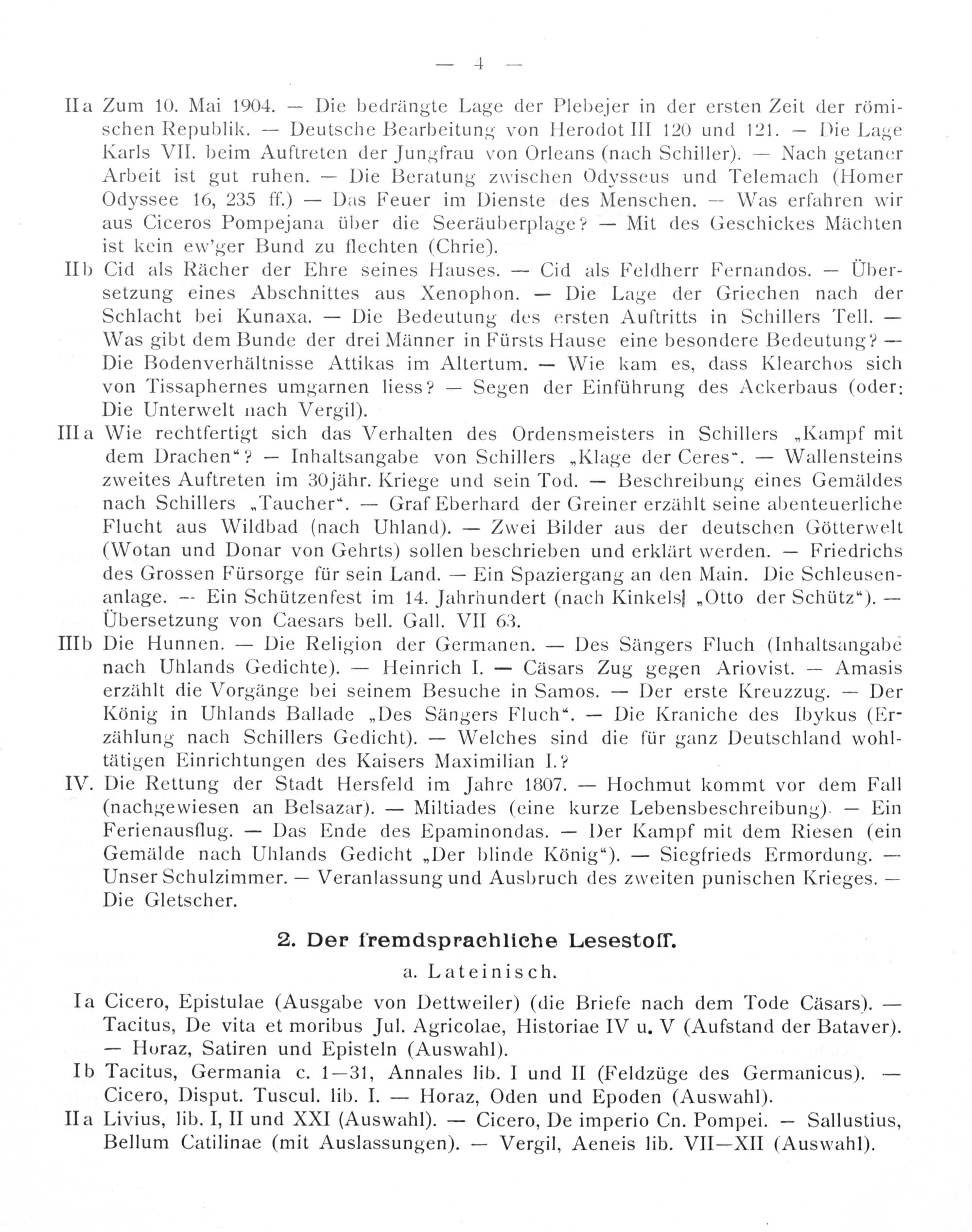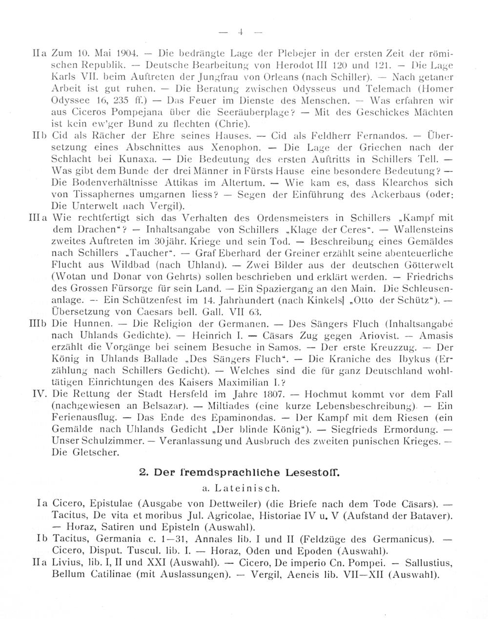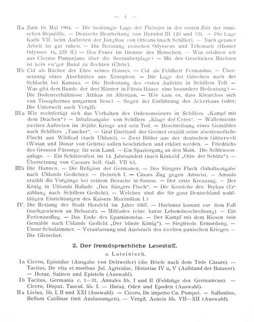 Zum 10. Mai 1904.— Die bedrängte Lage der Plebejer in der ersten Zeit der römi- schen Republik.— Deutsche Bearbeitung von Herodot III 120 und 121.— Die Lage Karls VII. beim Auftreten der Jungfrau von Orleans(nach Schiller).— Nach getancer Arbeit ist gut ruhen.— Die Beratung zwischen Odysseus und Telemach(Homer Odyssee 16, 235 ff.)— Das Feuer im Dienste des Menschen.— Was erfahren wir aus Ciceros Pompejana über die Seeräuberplage?— Mit des Geschickes Mächten ist kein ew'ger Bund zu flechten(Chrie).
