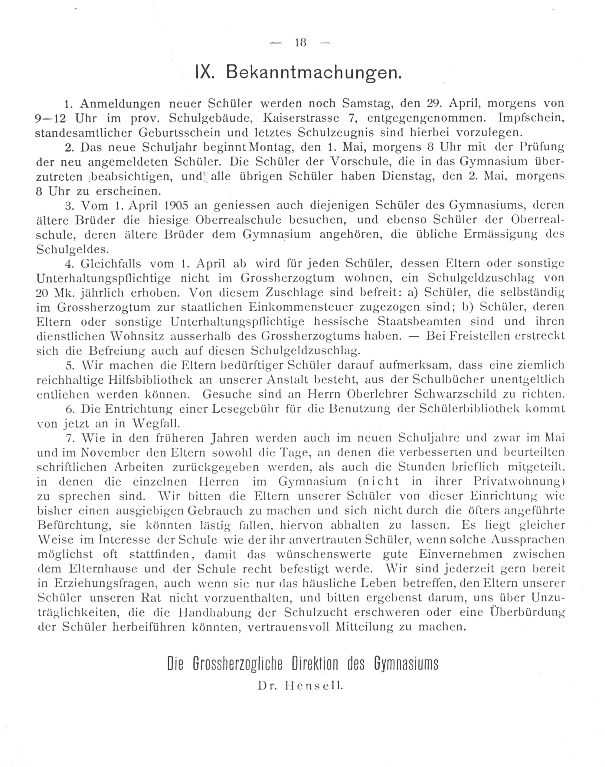 5. Wir machen die Eltern bedürftiger Schüler darauf aufmerksam, dass eine ziemlich reichhaltige Hilfsbibliothek an unserer Anstalt besteht, aus der Schulbücher unentgeltlich entliehen werden können. Gesuche sind an Herrn Oberlehrer Schwarzschild zu richten.