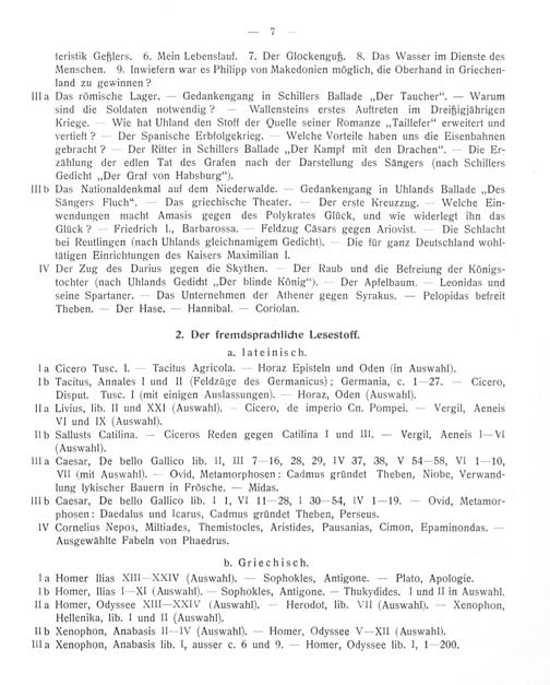 b. Griechisch. Homer llias XIII—XXIV(Auswahl).— Sophokles, Antigone.— Plato, Apologie. Homer, llias— XI(Auswahl).— Sophokles, Antigone.— Thukydides. Iund II in Auswahl. Homer, Odyssee XIII—XXIV(Auswahl).— Herodot, lib. VII(Auswahl).— Xenophon, Hellenika, lib. I und II(Auswahl). Xenophon, Anabasis II—IV(Auswahl).— Homer, Odyssee V— XII(Auswahl). Xenophon, Anabasis lib. I, ausser c. 6 und 9.— Homer, Odyssee lib. I, 1—200.