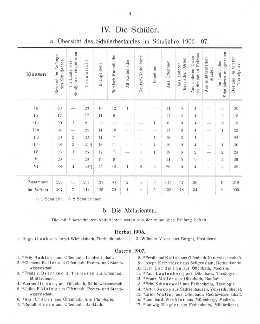V 5 V V„„ 8 3 4 4 2 S 2 3 5 S 2=2 8 2 S8S22SZ5 5 DB o 5 S 8 8do S 8 S 5 8 S 3 O 25 38 80 3 8 2 8 52 E½ 2 5 2 5 222 55 2 2 g z 1S 2 5— 2S 5 2 5 S 5 858 5 3 2 2 3 E klassen 2 3 5 2 5 35 3232 2 5 E SS88 2S5 22 2 2 ¹ 8 1 8 H 8 5 S 2₰ 282 8n o5 s e 8 5 2 83 5 2 23 25 5 8 5„ 58 2 2 5— 2 25 38SESS 1 8 4 2 4 1½ 21 4 2½ 6 3Z S 8 2 0 1 4 V S 82 2383 V V 9 V 2 5 ſ V ſeerf riſen la 23— 23 10 12 1— 14 5 4— 3 2o 1b 11— 1 11 6— 11 2 4 2 15 lla 20 1 21 9 11 1 89 4[— 2 19 1Ib 24— 24 14 10 11 9 4— 1 23 ma 26 2 22 4 7- 1 1s 3 1— 22 Illb 2s 3 31y 1 1— 1 1 1s 9 4— 1(30 IV 25 1 26 17 7— 1 1 18 6 2— 2 24 V 28 28 19 9— 14 5 9— 2 26 VI 38 4 4²*9 25 12 1 2—2 d9 9 4— 3 39 —— 24——— — p iä] Zusammen 223 11 234 137 85 2 4 V 6 141 V 57 36— 16 218 im Vorjahr 207 7 214 125 79 1 4 V 5 V 132 48 34 V— 9 205 ¹) 1 Schülerin. ²) 2 Schülerinnen. b. Die Abiturienten. Die mit* bezeichneten Abiturienten waren von der mündlichen Prüfung befreit. Herbst 1906. 1. Hugo Glaab aus Lützel-Wiebelsbach, Tierheilkunde. 2. Wilhelm Voos aus Bürgel, Postdienst. Ostern 1907.