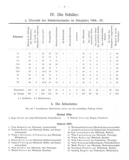 IV. Die Schüler. a. Ubersicht des Schülerbestandes im Schuljahre 1906— 07.