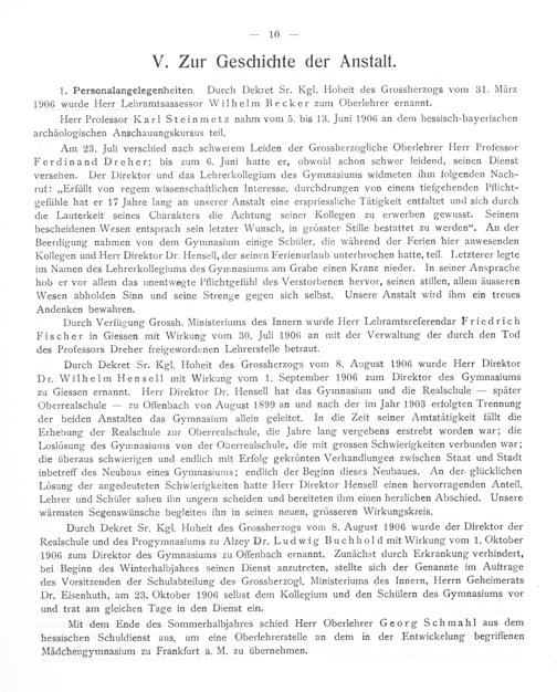 Durch Dekret Sr. Kgl. Hoheit des Grossherzogs vom 8. August 1906 wurde Herr Direktor Dr. Wilhelm Hensell mit Wirkung vom 1. September 1906 zum Direktor des Gymnasiums zu Giessen ernannt. Herr Direktor Dr. Hensell hat das Gymnasium und die Realschule— später Oberrealschule— zu Offenbach von August 1899 an und nach der im Jahr 1903 erfolgten Trennung der beiden Anstalten das Gymnasium allein geleitet. In die Zeit seiner Amtstätigkeit fällt die Erhebung der Realschule zur Oberrealschule, die Jahre lang vergebens erstrebt worden war; die Loslösung des Gymnasiums von der Oberrealschule, die mit grossen Schwierigkeiten verbunden war; die überaus schwierigen und endlich mit Erfolg gekrönten Verhandlungen zwischen Staat und Stadt inbetreff des Neubaus eines Gymnasiums; endlich der Beginn dieses Neubaues. An der. glücklichen Lösung der angedeuteten Schwierigkeiten hatte Herr Direktor Hensell einen hervorragenden Anteil. Lehrer und Schüler sahen ihn ungern scheiden und bereiteten ihm einen herzlichen Abschied. Unsere wärmsten Segenswünsche begleiten ihn in seinen neuen, grösseren Wirkungskreis.