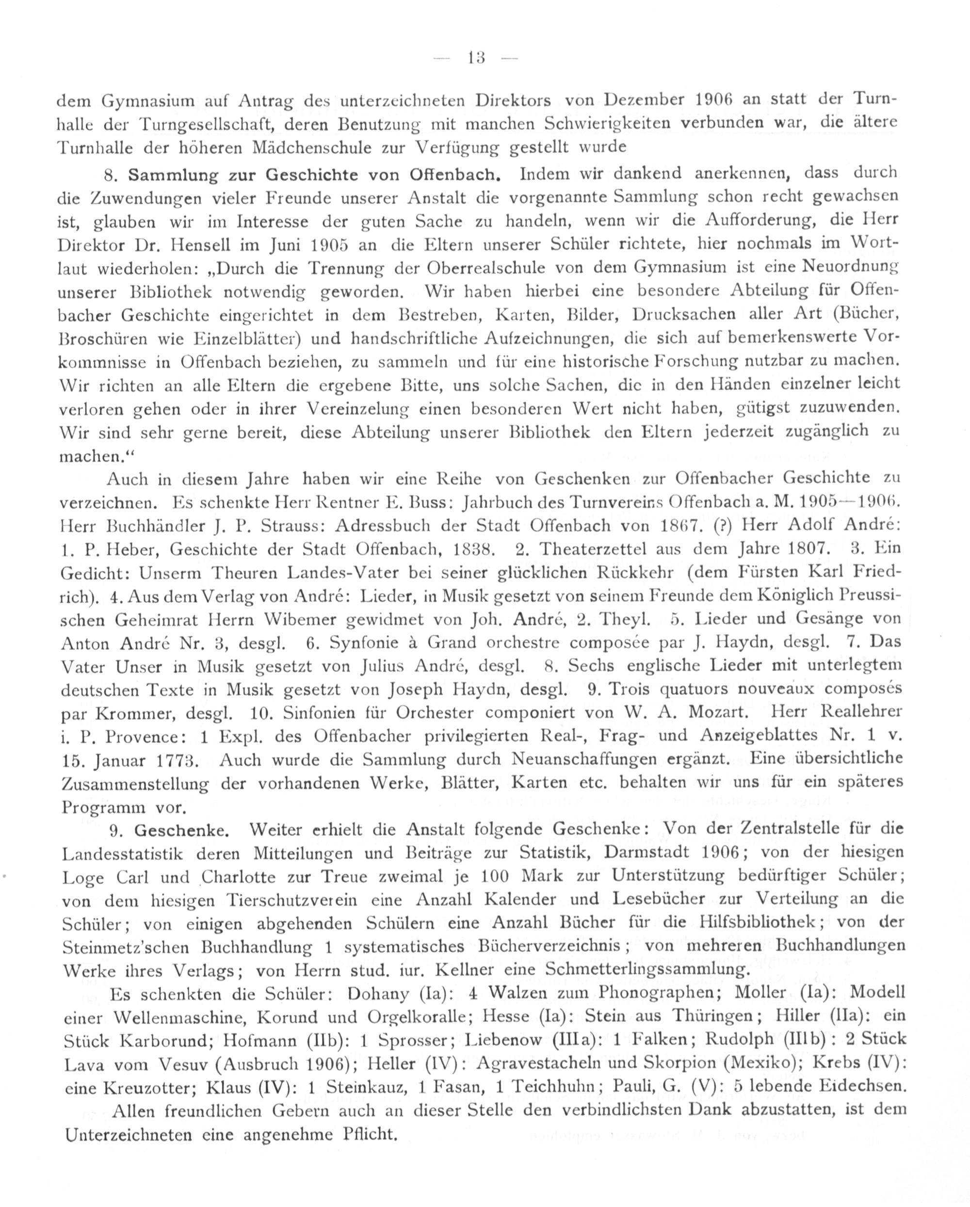 Auch in diesem Jahre haben wir eine Reihe von Geschenken zur Offenbacher Geschichte zu verzeichnen. Es schenkte Herr Rentner E. Buss: Jahrbuch des Turnvereins Offenbach a. M. 1905— 1906. Herr Buchhändler J. P. Strauss: Adressbuch der Stadt Offenbach von 1867.(?) Herr Adolf André: 1. P. Heber, Geschichte der Stadt Offenbach, 1838. 2. Theaterzettel aus dem Jahre 1807. 3. Ein Gedicht: Unserm Theuren Landes-Vater bei seiner glücklichen Rückkehr(dem Fürsten Karl Fried- rich). 4. Aus dem Verlag von André: Lieder, in Musik gesetzt von seinem Freunde dem Königlich Preussi- schen Geheimrat Herrn Wibemer gewidmet von Joh. André, 2. Theyl. 5. Lieder und Gesänge von Anton André Nr. 3, desgl. 6. Synfonie à Grand orchestre composée par J. Haydn, desgl. 7. Das Vater Unser in Musik gesetzt von Julius André, desgl. 8. Sechs englische Lieder mit unterlegtem deutschen Texte in Musik gesetzt von Joseph Haydn, desgl. 9. Trois quatuors nouveaux composés par Krommer, desgl. 10. Sinfonien für Orchester componiert von W. A. Mozart. Herr Reallehrer i. P. Provence: 1 Expl. des Offenbacher privilegierten Real-, Frag- und Anzeigeblattes Nr. 1 v. 15. Januar 1773. Auch wurde die Sammlung durch Neuanschaffungen ergänzt. Eine übersichtliche Zusammenstellung der vorhandenen Werke, Blätter, Karten etc. behalten wir uns für ein späteres Programm vor.