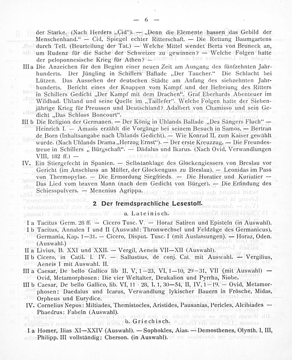 der Starke.(Nach Herders„Cid“).—„Denn die Elemente hassen das Gebild der Menschenhand.“— Cid, Spiegel echter Ritterschaft.— Die Rettung Baumgartens durch Tell.(Beurteilung der Tat.)— Welche Mittel wendet Berta von Bruneck an, um Rudenz für die Sache der Schweizer zu sewinnen?— Welche Folgen hatte der peloponnesische Krieg für Athen?—