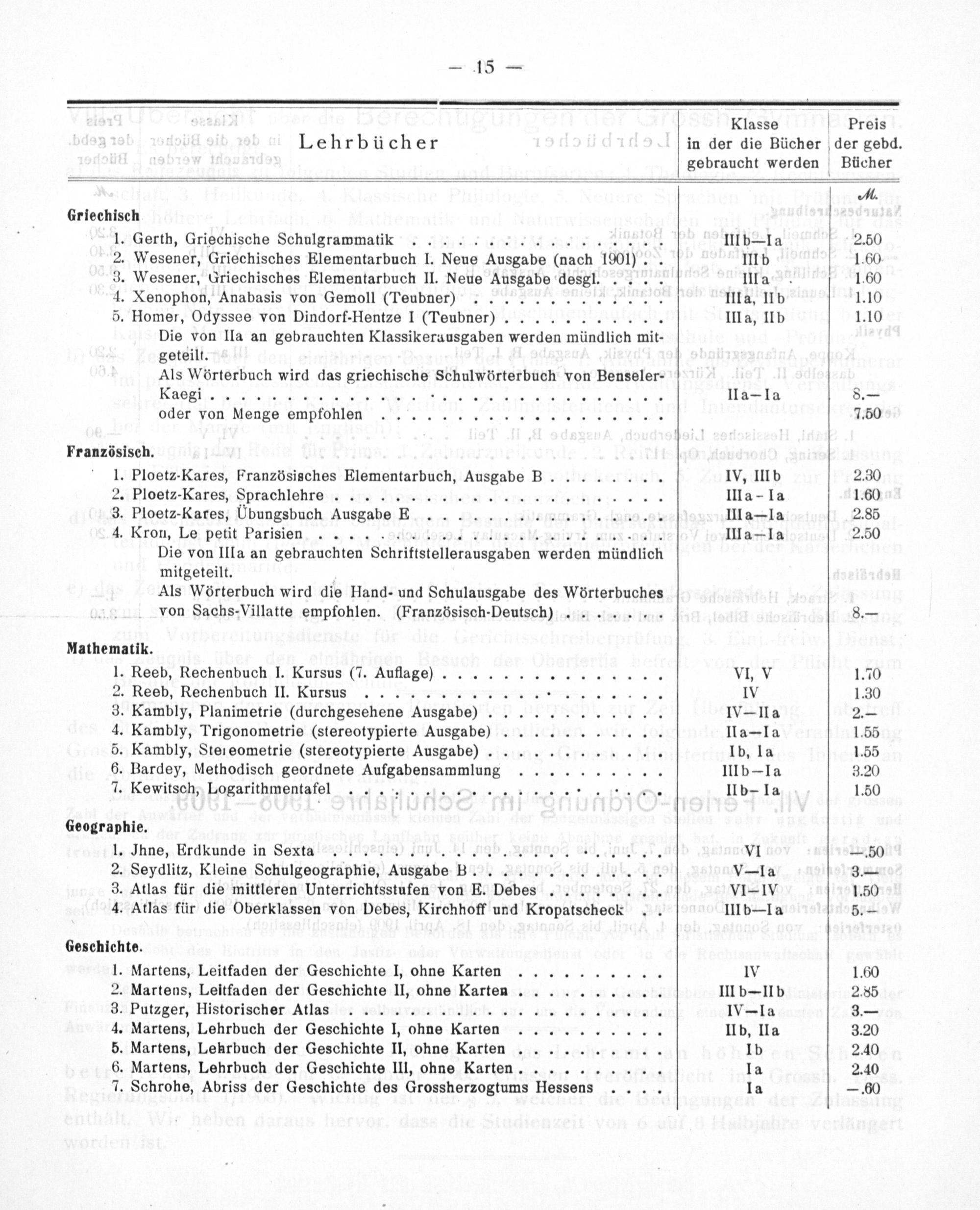 Klasse Preis Lehrbücher in der die Bücher der gebd. gebraucht werden Bücher . Griechisch 1. Gerth, Grigchische Schulgrammatikk............... IIIb— Ia 2.50 2. Wesener, Griechisches Elementarbuch I. Neue Ausgabe(nach 1901).. III b 1.60 3. Wesener, Griechisches Elementarbuch II. Neue Ausgabe desgl..... IIla. 1.60 4. Xenophon, Anabasis von Gemoll(Teubner)............. IIIa, IIb 1.10 5. Homer, Odyssee von Dindorf-Hentze I(Teubner)........... IIIa, IIb 1.10 Die von Ila an gebrauchten Klassikerausgaben werden mündlich mit- geteilt. Als Wörterbuch wird das griechische Schulwörterbuch von Benseler- Kaeggi......... IIa- Ia 8.— oder pon, Menge empfohloen.................. 7.50 Französisch. 1. Ploetz-Kares, Französisches Elementarbuch, Ausgabe B........ IV, IIIb 2.30 2. Ploetz-Kares, Sprachlehre..................... IIla- Ia 1.60 3. Ploetz-Kares, Ubungsbuch Ausgabe E................ IIl a- la 2.85 4. Kron, Le petit Parisien..... 9.......„....2. IIIa— Ia 2.50 Die von IIla an gebrauchten Schriftstellerausgaben werden mündlich mitgeteilt. Als Wörterbuch wird die Hand- und Schulausgabe des Wörterbuches von Sachs-Villatte empfohlen.(Französisch-Deutsch)....... 8.— Mathematik. 1. Reeb, Rechenbuch I. Kursus(7. Auflage. VI, V 1.70 2. Reeb, Rechenbuch II. Kursuss.......... IV 1.30 3. Kambly, Planimetrie(durchgesehene Ausgabe)............ IV- II a 2.— 4. Kambly, Trigonometrie(stereotypierte Ausgabe)........... Ila—Ia 1.55 5. Kambly, Stereometrie(stereotypierte Ausgabe)............ Ib, Ia 1.55 6. Bardey, Methodisch geordnete Aufgabensammlung.......... IIIb— Ia 3.20 7. Kewitsch Logarithmentafel............ IIb- Ia 1.50 Geographie. l. Ihne, Erdkunde in Sexta...... l. 1..ie.. 2. i. n...8. Ie.. VI—. 50 2. Seydlitz, Kleine Schulgeographie, Ausgabe B............. V— la 3.— 3. Atlas für die mittleren Unterrichtsstufen von E. Debes........ VI-IV 1.50 4. Atlas für die Oberklassen von Debes, Kirchhoff und Kropatscheck.. III b— Ia 5.— Geschichte. 1. Martens, Leitfaden der Geschichte I, ohne Karten.......... IV 1.60 2. Martens, Leitfaden der Geschichte II, ohne Karten.......... III b— IIb 2.85 3. Putzger, Historischer Atlas.................... IV- la 3.— 4. Martens, Lehrbuch der Geschichte I, ohne Karten.......... IIb, IIa 3.20 5. Martens, Lehrbuch der Geschichte II, ohne Karten.......... Ib 2.40 6. Martens, Lehrbuch der Geschichte III, ohne Karten.......... Ia 2.40 7. Schrohe, Abriss der Geschichte des Grossherzogtums Hessens.... Ia—. 60