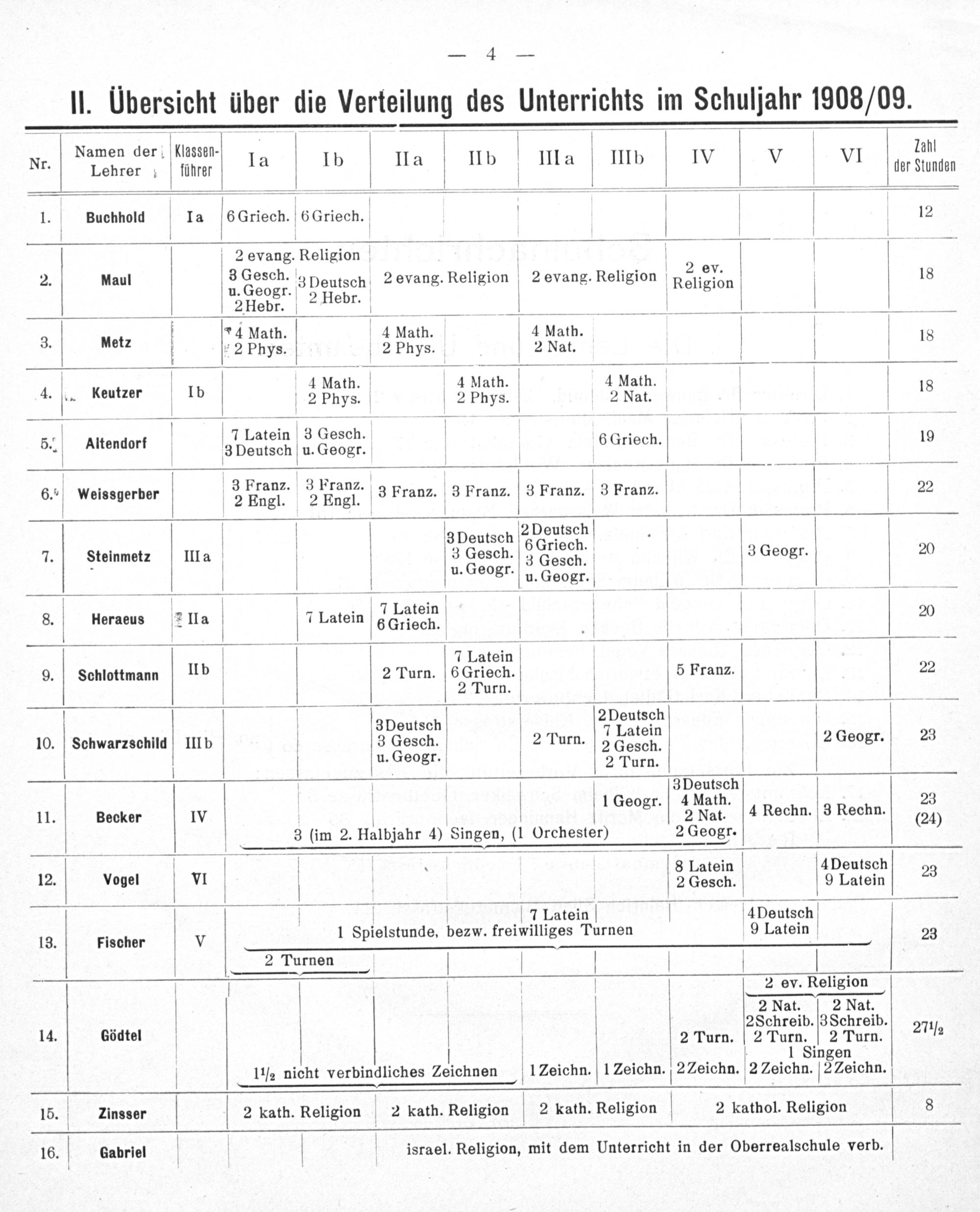 ——— Namen der! tnsstn. V. Lahl Nr. Lehrer, führer 6 Ia Ib II a IIb V III a IIIb I IV V VI ger dtonden 1. Buchhold Ia(6Griech. I 6Griech. V V 12 1——— 2 evang. Reigfom 2. Maul— 31 Deutsch 2 evang. Religion 2 evang. Religion n2 eden 18 2Hebr. 2 Hebr. V v4 Math. 4 Math 4 Math 3. Metz 2 Phys. 2 Phys 2 Nat V 18 4 Math. 4 Math 4 Math 4. Ee Keutzer 1 V 2 phys. V 2 Phys 2 Nat 18 7 Latein 3 Gesch. 8 5- Altendorf s Deutsch V u. Geogr. V V V 6 Griech. V 19 6.“ Weissgerber V 4 Tzaun. a Fraus. 3 Franz. 3 Franz. b 3 Pranz. 22 3 Deutsch Domdeh 7. Steinmetz IIl a 3 Gesch. 5 elden. 3 Geogr 20 u. Geogs. u. Geogr. V————————— 2 7. 7 Latein 8. Heraeus 2 IIa Latein 6 Griech. V V V 20 lmen, ſ 8 9. Schlottmann IIb 2 Turn. 6 Griech. 5 Franz. 22 2 Turn. 3 Deutsch 2Deutsch 10. Schwarzschild IIIb V 3 Gesch. 2 Turn. 4 Fatein 2 Geogr. 23 2 Gesch. l, Koogr. 2 Turn. Deuisen — t— 11. Becker IV V 19e 4 Nat. 4 Rechn. 3 Rechn. 66 3(im 2. Halbjahr 4) Singen,(1 Orchester) 2 Geogr. in 8 Latein 4 Deutsch 12. Vogel VI V 2 Gesch. V 9 Latein 23 1— V 7 Latein 4 Deutsch 13. Fischer V 1 Spielstunde, bezw. freiwilliges Turnen 9 Latein 23 2 Turnen ſ V 2 ev. Religion 3. Nat. 3 2 kaleh 5 2Schreib. 3 Schreib. 14. Gödtel V 2 Turn. 2 Turn. 2 Turn. 271½ V 1 Singen 1 ½ nicht verbindliches Zeichnen 1Zeichn. 1 Zeichn.[2Zeichn. 2 Zeichn. TLeichn. „. 15. Zinsser 2 kath. Religion 2 kath. Religion V 2 kath. Religion V 2 kathol. Religion 8 16. Gabriel V V israel. Religion, mit dem Unterricht in der Oberrealschule verb.