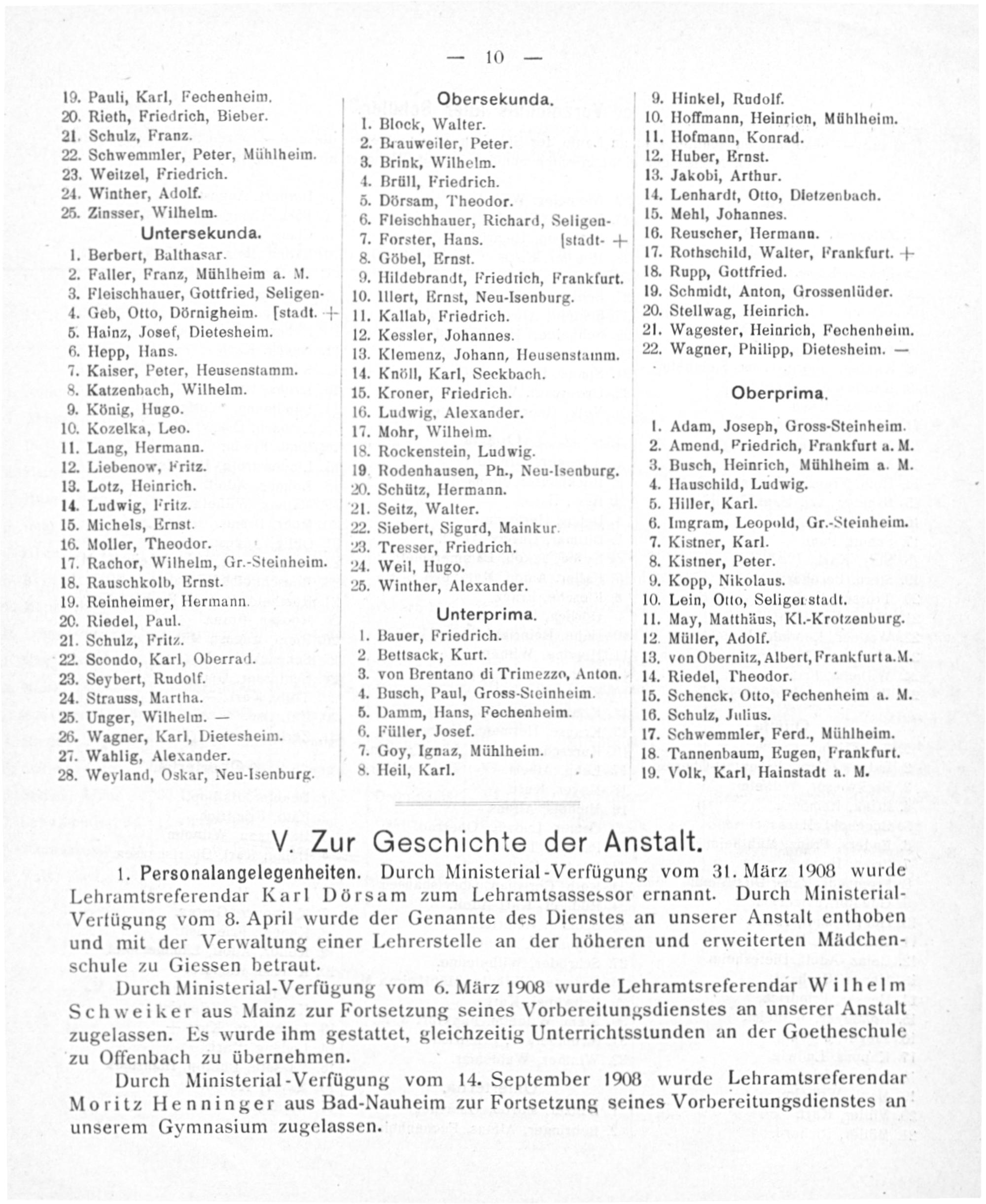 Vertügung vom 8. April wurde der Genannte des Dienstes an unserer Anstalt enthoben und mit der Verwaltung einer Lehrerstelle an der höheren und erweiterten Mädchen- schule zu Giessen betraut. Durch Ministerial-Verfügung vom 6. März 1908 wurde Lehramtsreferendar Wilhelm Schweiker aus Mainz zur Fortsetzung seines Vorbereitungsdienstes an unserer Anstalt zugelassen. Es wurde ihm gestattet, gleichzeitig Unterrichtsstunden an der Goetheschule zu Offenbach zu übernehmen. Durch Ministerial-Verfügung vom 14. September 1906 wurde Lehramtsreferendar Moritz Henninger aus Bad-Nauheim zur Fortsetzung seines Vorbereitungsdienstes an unserem Gymnasium zugelassen.