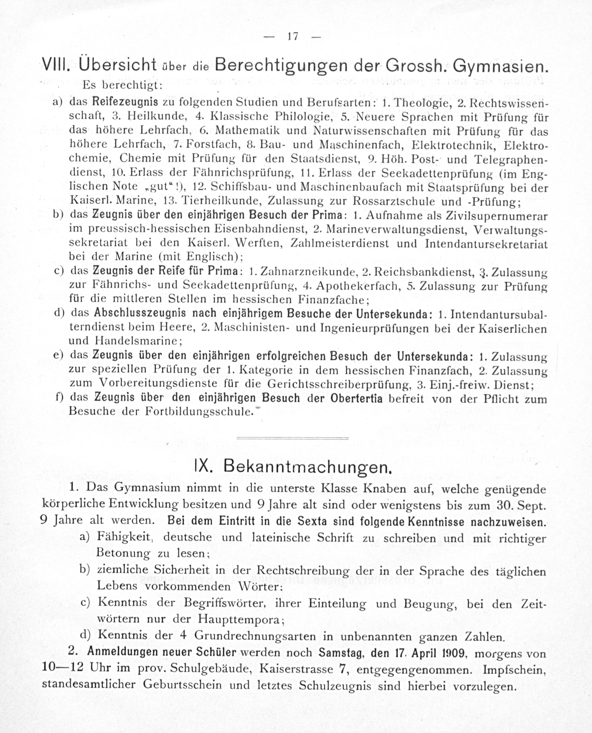 2. Anmeldungen neuer Schüler werden noch Samstag, den 17. April 1909, morgens von 10— 12 Uhr im prov. Schulgebäude, Kaiserstrasse 7, entgegengenommen. Impfschein, standesamtlicher Geburtsschein und letztes Schulzeugnis sind hierbei vorzulegen.