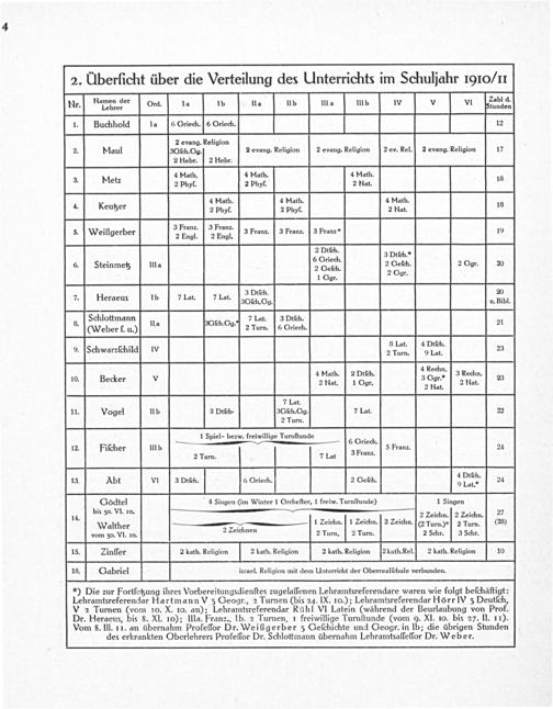 N' der Zahl d. r. mdn de Ord. la lb Ua Ub llla Ulb IN V VI tunden 1. Buchhold la 6 Criech.] 6 Criech. 12 2 evang. Religion 2. Maul 3ſch. Og. 2 evang. Religion 2 evang. Religion 2 ev. Rel.] 2 evang. Religion 17 2 Hebr. 2 Hebr. 4 Math. 4 Math. 4 Math. 3 Metz 2 phyf. 2 phyf. 2 Nat. 18 4 Math. 4 Math. 4 Math. 4. kKreutzer 2 phyf. 2 phyſ. 2 Nat. 4 . 3 Franz. 3 Franz.. 5. Weißgerber 2 Engi. 2 Engl. 3 Franz. 3 Franz. 3 Franz 19 fre 6. Steinmetz Ula 4 2 Ceſch. 2 Ogr. 20 2 Geſch. 2 Dar 1 Ggr. gr. 3 Dtſch. 20 7. Heraeus 1b 7 Lat. 7 Lat. 30 h.Og. u. Bibl. Schlottmann 7 Lat. 3 Dtich. 6.(Weber Tu.) A* Bſh Og.] 2 Turn. 6 Criech. 24 . 8 Lat. 4 Dtſch. 9.[Schwarzſchild N 2 Turn. 9 Lat. 23 4 Rechn 4 Math. 2 Dtſch.[3 Rechn. 10. Becker V 3 Ggr.*. 23 2 Nat. 1 Ggr. 2 Nat. 2 Mat. 7 Lat. 11. Vogel llb 3 Dtſch- 3Gſch. Gg. 7 Lat. 22 2 Turn. 1 Spiel- bezw. freiwillige Turnſtunde 6 Ceiech. 12. Fiſcher ulb 5 Franz. 24 2 Turn. 7 Lat 3 Franz. 33. Abt vI 3 Dtch. 6 Oriech. 2 Ceſch. 2eGh. 24 Gödtel 4 Singen(im Winter 1 Orcheſter, 1 freiw. Turnſtunde) 1 Singen 14. bis 30. VI. 10. 2 Zeichn.] 2 Zeichn. 27 Walther— 1 Zeichn. ſ1 Zeichn. 2 Zeichn.(2 Turn.)*]2 Turn.(23) vom 30. VI. 10. 2 Zeichnen 2 Turn. 2 Turn. 2 Schr. 3 Schr. 15. Zinſſer 2 kath. Religion 2 kath. Religion 2 kath. Religion[2 kath. Rel. 2 kath. Religion 10 16. Gabriel israel. Religion mit dem Unterricht der Oberrealſchule verbunden.