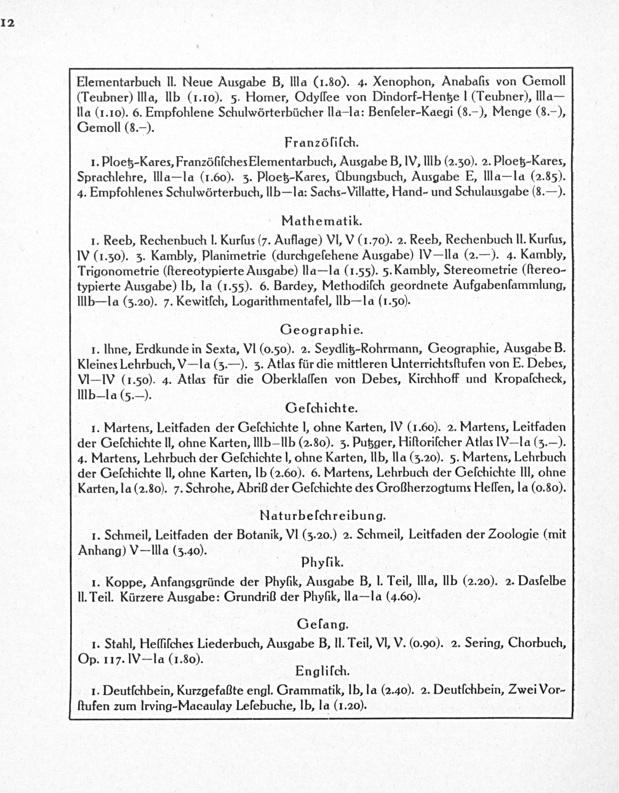 1. Martens, Leitfaden der Geſchichte!, ohne Karten, IV(1.60). 2. Martens, Leitfaden der Gelchichte ll, ohne Karten, IlIb-llb(2. 80). 3. Putzger, Hiſtoriſcher Atlas IV- la(3.—). 4. Martens, Lehrbuch der Gelſchichte!, ohne Karten, llb, lla(3.20). 5. Martens, Lehrbuch der Gelchichte lI, ohne Karten, lb(2. 60). 6. Martens, Lehrbuch der Geſchichte Ill, ohne Karten, la(2. 80). 7. Schrohe, Abriß der Geſchichte des Großherzogtums Heſſen, la(oO. 80).