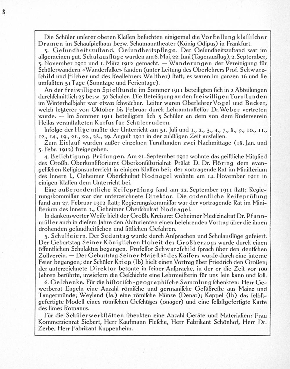 5. Schulfeiern. Der Sedantag wurde durch Anſprachen und Schulausflüge gefeiert. Der Geburtstag Seiner Königlichen Hoheit des Großherzogs wurde durch einen öffentlichen Schulaktus begangen. Profeſſor Schwarzſchild ſprach über den deutſchen Zollverein.— Der Geburtstag Seiner Majeſtät des Kaifers wurde durch eine interne Feier begangen; der Schüler Kriep(1b) hielt einen Vortrag über Friedrich den Großen; der unterzeichnete Direktor betonte in ſeiner Anſprache, in der er die Zeit vor 100 Jahren berührte, inwiefern die Geſchichte eine Lehrmeiſterin für uns ſein kann und ſoll.