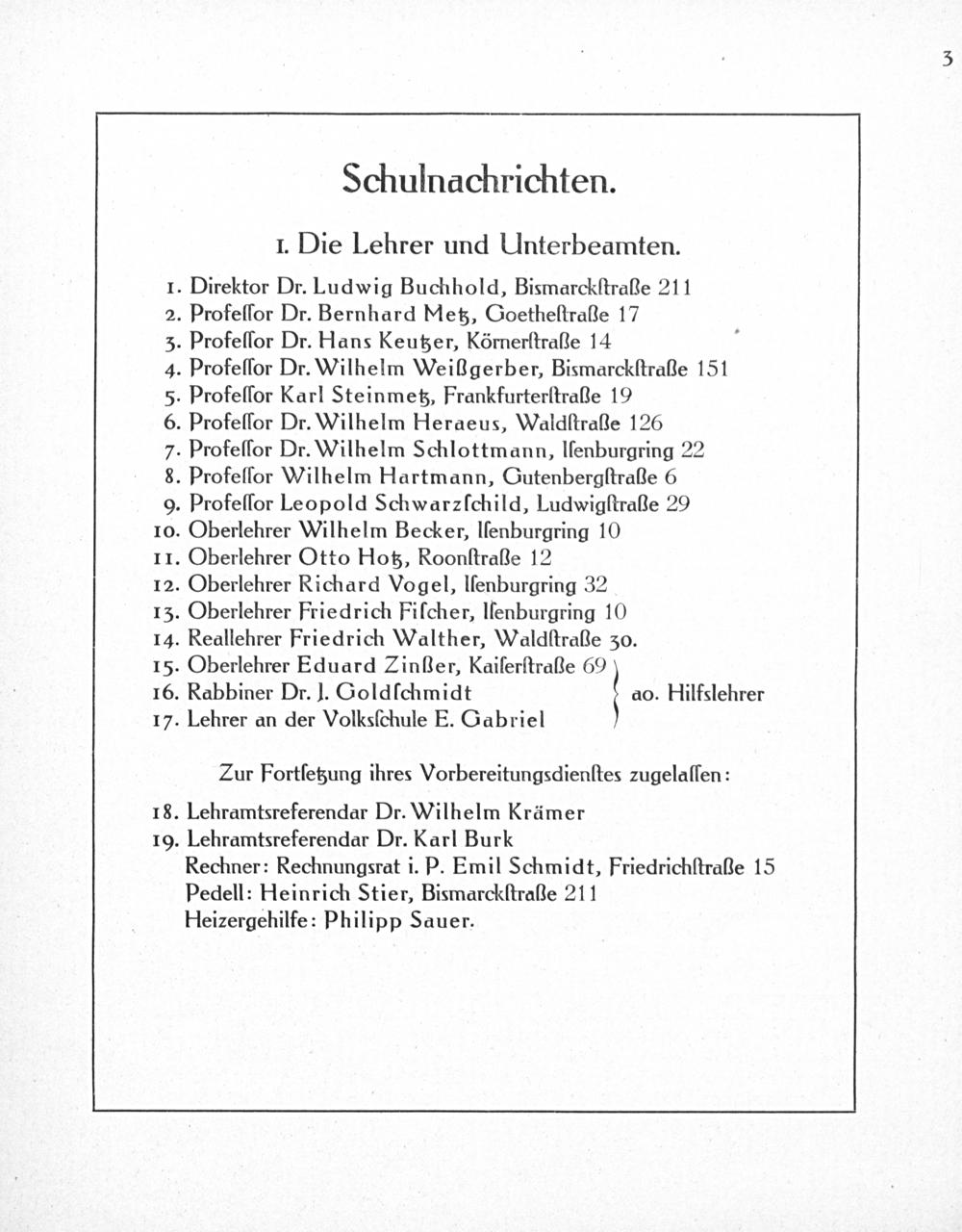 Pedell: Heinrich Stier, Bismarckſtraße 211 Heizergehilfe: Philipp Sauer.