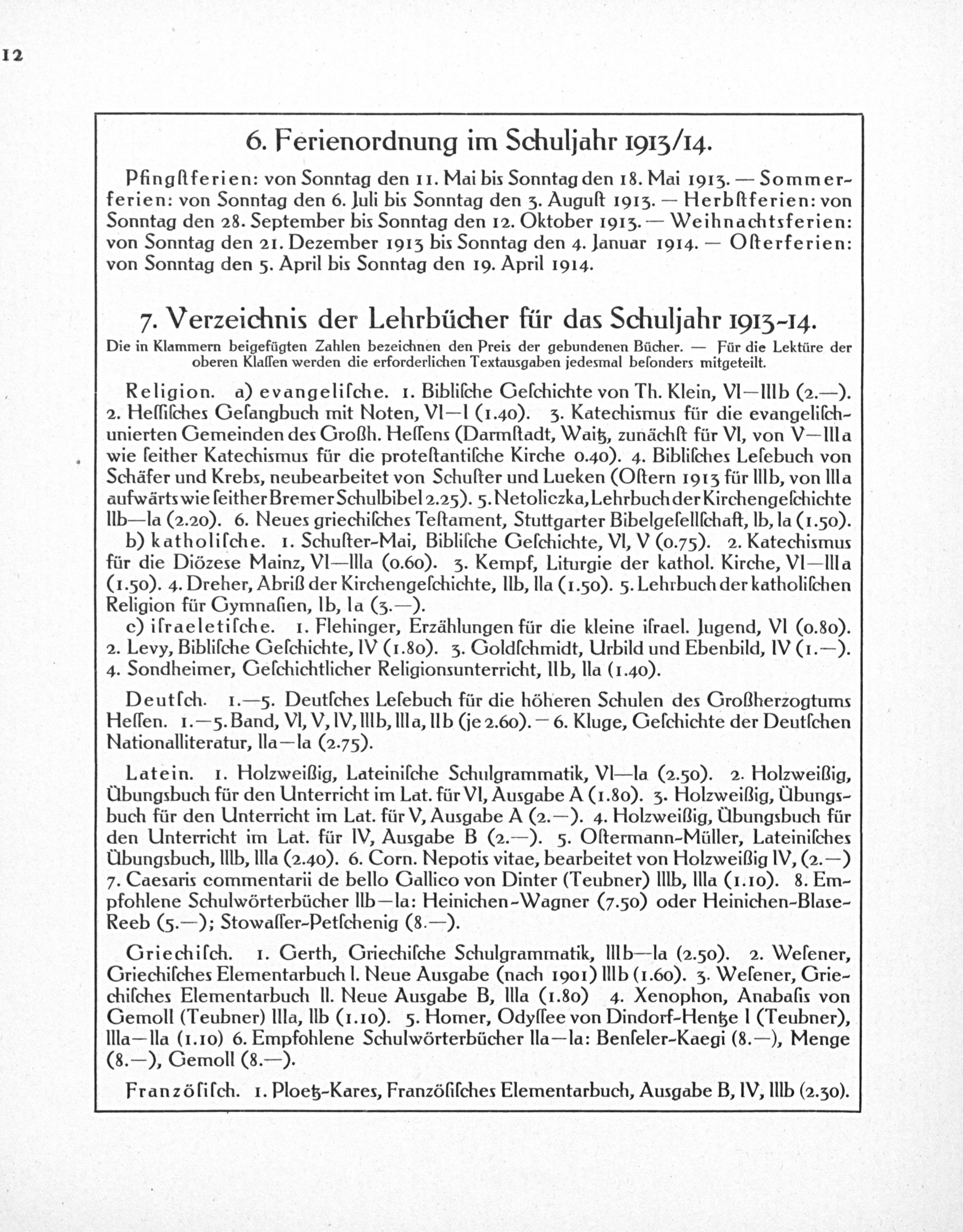 b) katholilche. 1. Schuſter-Mai, Bibliſche Geſchichte, VI, V(o. 75). 2. Katechismus für die Diözese Mainz, VI—llla(o.60). 3. Kempf, Liturgie der kathol. Kirche, VI-llla (1.50). 4. Dreher, Abriß der Kirchengeſchichte, llb, lla(1.50). 5. Lehrbuch der katholiſchen Religion für Gymnalſien, Ib, la(3.—).