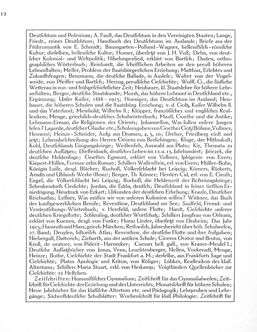 Deutſchtum und Polentum; A. Fauſt, das Deutſchtum in den Vereinigten Staaten; Lange, Friedr., reines Deutſchtum; Handbuch des Deutſchtums im Auslande; Briefe aus der Frühromantik von E. Schmidt; Baumgarten-Polland-Magner, helleniſtiſch-römiſche Kultur; dieſelben, helleniſche Kultur; Homer, überſetzt von J. H. Voß; Dehn, von deut- ſcher Kolonial- und Weltpolitik; Nibelungenlied, erklärt von Bartſch; Duden, ortho- graphiſches Wörterbuch; Reinhardt, die ſchriſtlichen Arbeiten an den preuß. höheren Lehranſtalten; Mellſer, Problem der ſtaatsbürgerlichen Erziehung; Matthias, Erlebtes und Zukunftsfragen; Benzmann, die deutſche Ballade, in Auslelſe; Walter von der Vogel- weide, von Pfeiffer und Bartſch; Herzog, preußiſche Geſchichte; Wolff, G., die füdliche Wetterau in vor- und frühgeſchichtlicher Zeit; Neubauer, kl. Staatslehre für höhere Lehr- anſtalten; Berger, deutſche Staatskunde; Morsh, das höhere Lehramt in Deutſchland etc., Ergänzung; Unſer Kaiſer, 1888— 1915; Hoeniger, das Deutſchtum im Ausland; Neu- bauer, die höheren Schulen und die ſtaatsbürg. Erziehung; v. d. Goltz, Kaiſer Wilhelm lIl. und das Vaterland; Meinhold, Wilhelm Il.; Klöpper, franzõöſiſches und engliſches Real- lexikon; Menge, griechiſch-deutſches Schulwörterbuch; Maaß, Goethe und die Antike; Lehmann-Erman, die Religionen des Orients; Iohanneſſon, Was ſollen unſere Jungen leſen? Lagarde, deutſcher Glaube ete.; Schulausgabenvon Goethes Götz(Böhme, Vollmer, Heuwes); Heinze-Schröder, Aufg. aus Dramen, 4, 5, 10; Dreher, Friedberg einſt und jetzt; Lebensbeſchreibung des Herren Gözens von Berlichingen; Kluge, der Mithrakult; Kohl, Deutſchlands Einigungskriege; Weißenfels, Auswahl aus Plato; Kiy, Themata zu deutſchen Auflſätzen; Dieffenbach, deutſches Leben im 12. u. 13. Jahrhundert; liriczek, die deutſche Heldenlage; Goethes Egmont, erklärt von Vollmer, lphigenie von Evers; Kiepert-Hülſen, Formae urbis Romae; Schillers Wallenſtein, erl. von Evers; Müller-Bohn, Königin Luiſe, desgl. Blücher; Rocholl, Völkerſchlacht bei Leipzig; Körners, Rückerts, Arndts und Uhlands Werke(Bonz); Berger, Th. Körner; Herders Cid, erl. von E. Groth; Engel, die Völkerſchlacht bei Leipzig; Rocholl, die Heldenzeit der Befreiungskriege; Schenkendorfs Gedichte; Jordan, die Edda, deutſch; Deutſchland in ſeiner tiefſten Er- niedrigung, Neudruck von Eckart; Urkunden der deutſchen Erhebung; Krauſe, Deutſcher Reichsatlas; Leſfner, Was müſſen wir von unſeren Kolonien wiſſen? Widmer, das Buch der kunſtgewerblichen Berufe; Reventlow, Deutſchland zur See; Saalfeld, Freind- und Verdeutſchungs-Wörterbuch; v. Hersfeld, unſere Flotte; Hardt, Geſchichte unferer deutſchen Kriegsflotte; Schleuſing, deutſcher Wortſchatz; Schillers Jungfrau von Orleans, erklärt von Kuenen, desgl. von Funke; Horaz Lieder, überlſetzt von Draheim; Das Jahr 1913; Hausrathund Marx, griech. Märchen; Rethwiſch, Jahresbericht über höh. Schulweſen, 27. Band; Droyſen, hiſtoriſch. Atlas; Reventlow, die deutſche Flotte und ihre Aufgaben; Niebergall, Datterich; Ziebarth, aus der antiken Schule; Ciceros Orator und Brutus, von Kroll, de oratore, von Piderit-Harnecker; Caesars bell. gall., von Kraner-Meuſel l.; Deutſche Auflatzbücher von Jonas, Venn, Leuchtenberger, Nellen, Vockeradt, Menge, Heinze; Bothe, Geſchichte der Stadt Frankfurt a. M.; derſelbe, aus Frankfurts Sage und Geſchichte; Platos Apologie und Kriton, von Röſiger; Lübker, Reallexikon des klallf. Altertums; Schillers Maria Stuart, erkl. von Heskamp; Voigtländers Quellenbücher zur Geſchichte: 22 Heftchen.